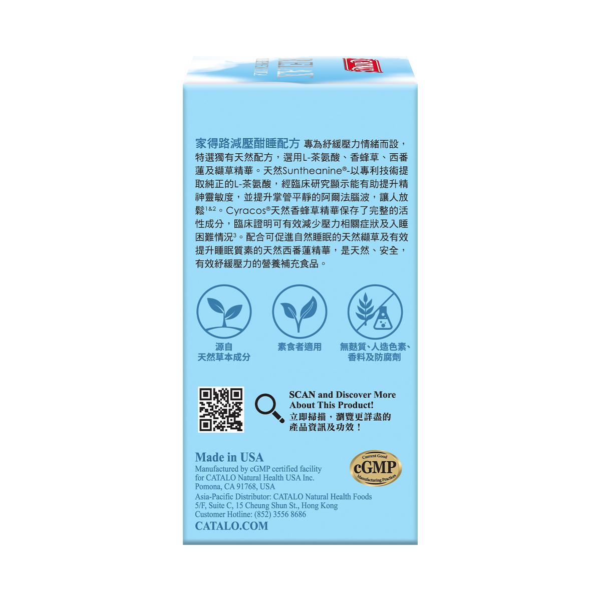 家得路減壓酣睡配方專為紓緩壓力情緒而設,特選獨有天然配方,選用純L-茶氨酸、香蜂草、西番蓮及纈草精華。配方選用天然Suntheanine®-採用專利技術所提取的100%精純的L-茶氨酸,臨床研究顯示能有助提升精神靈敏度,並提升掌管平靜的阿爾法腦波,讓人放鬆1&2。Cyracos®天然香蜂草精華保存了完整的活性成份,臨床證明可有效減少壓力相關症狀及入睡困難情況3。配合可促進自然睡眠的天然纈草及有效提升睡眠質素的天然西番蓮精華,是天然、安全有效紓緩壓力的營養補充食品。