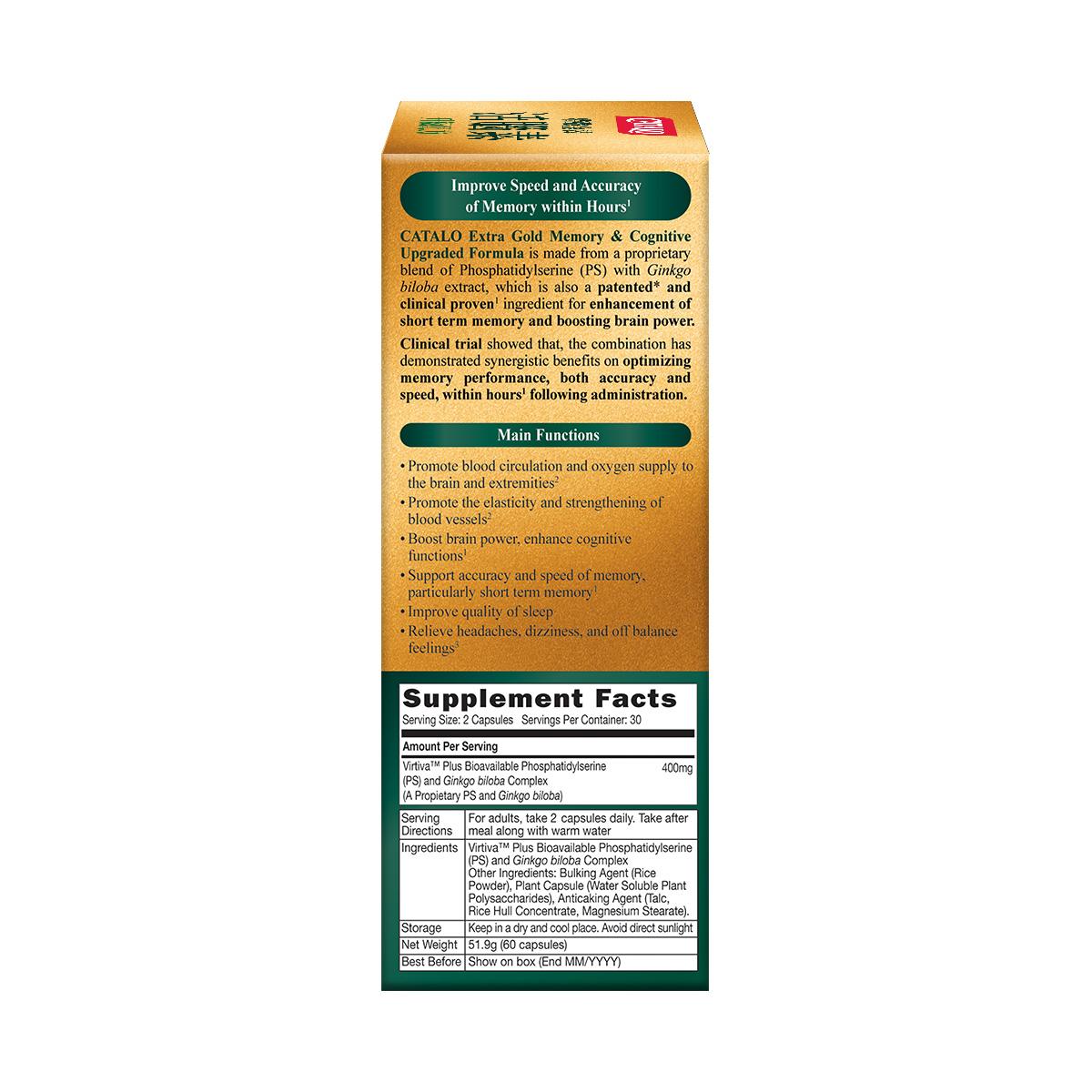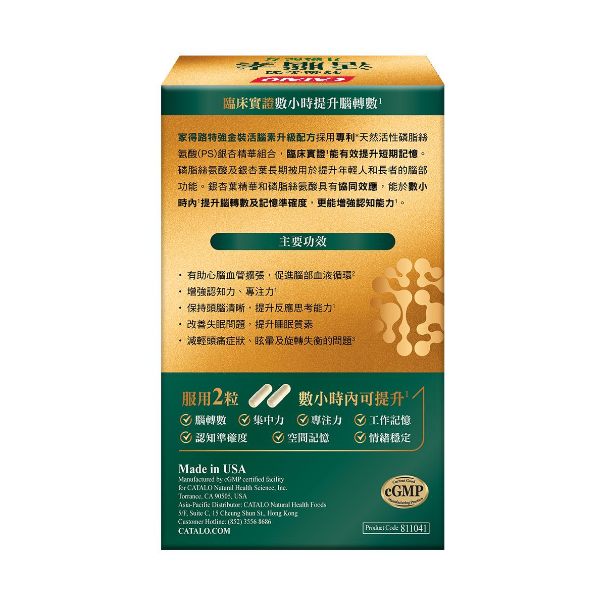家得路特強金裝活腦素升級配方採用專利*天然活性磷脂絲氨酸(PS)銀杏精華組合,臨床實證1能有效提升短期記憶。磷脂絲氨酸及銀杏葉長期被用於提升年輕人和長者的腦部功能。銀杏葉精華和磷脂絲氨酸具有協同效應,能於數小時內1提升腦轉數及記憶準確度,更能增強認知能力1。