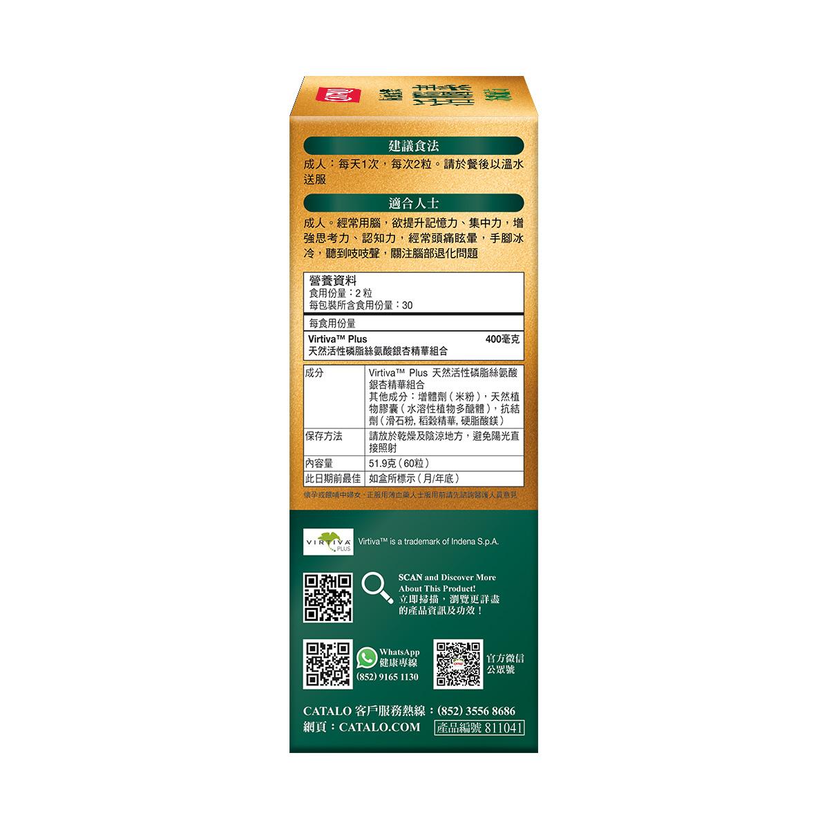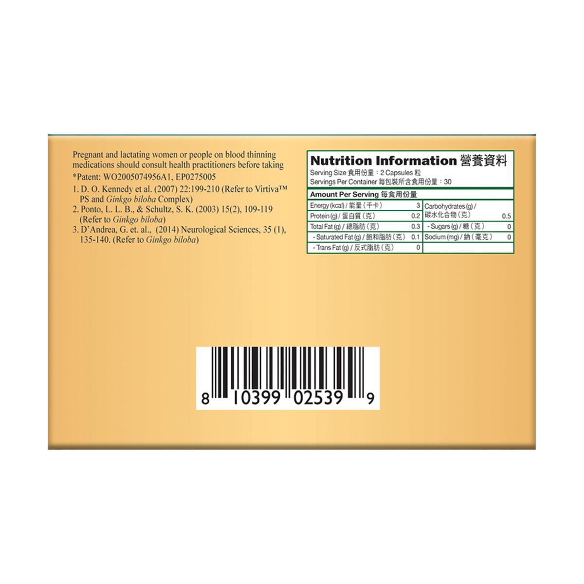 Virtiva™ Plus 天然活性磷脂絲氨酸銀杏精華組合 其他成分:增體劑(米粉),天然植物膠囊(水溶性植物多醣體),抗結劑(滑石粉, 稻穀精華, 硬脂酸鎂)