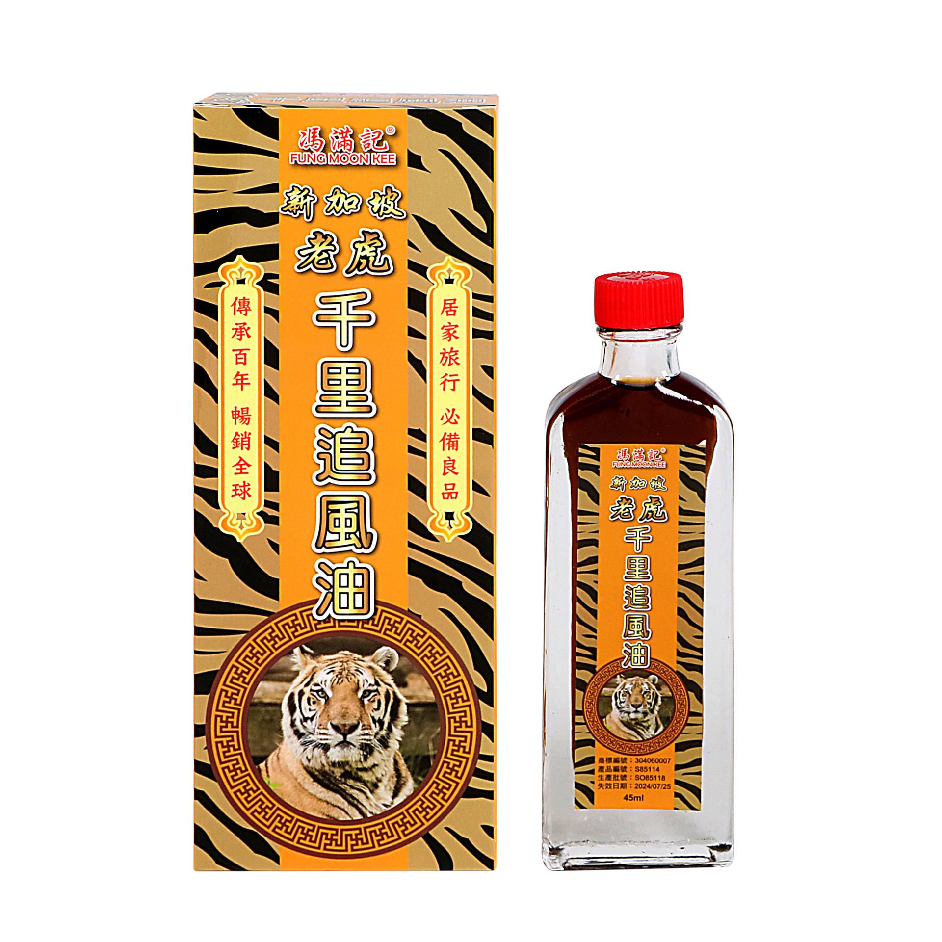 單品凈含量:45亳升 /支;使用劑量:將適量老虎千裏追風油塗擦於患處直至滲透患處,每日搽用2-3次;有效期:60個月;藥品通用名:馮滿記老虎千裏追風油 45ml;藥品名稱:馮滿記老虎千裏追風油 45ml