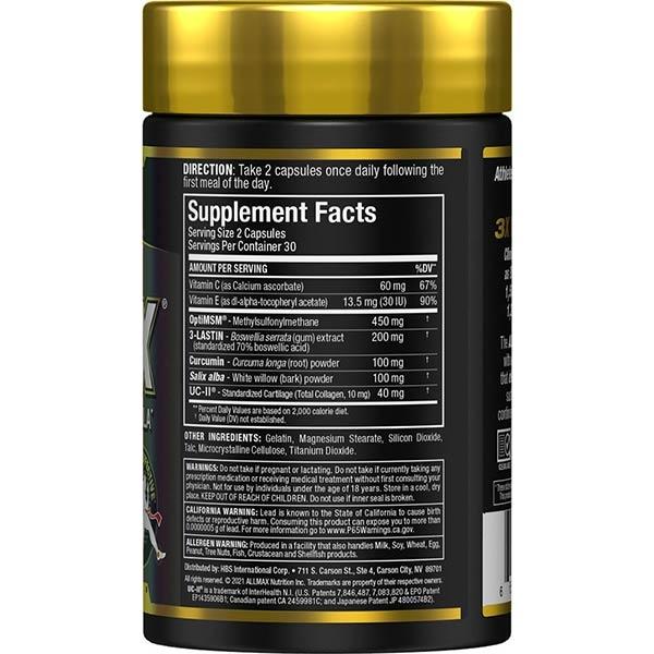 ALLFLEX是一種先進的恢復緩解劑,可促進關節健康和活動能力,並減少與劇烈體育活動相關的疼痛和炎症。作為一種專有混合物,它是為活躍的個人和參加高強度運動的競技運動員配製的。ALLFLEX遞送系統從快速釋放的微薄膠囊開始,可快速提供結果,並具有在12小時內持續工作的緩釋配方。你的關節會受到衝擊,直到現在,只有常規的、相同的舊關節止痛成分。在6項人體臨床試驗的支援下,ALLFLEX®與UC-II®為您提供了反擊的工具! 臨床顯示,與1,500毫克氨基葡萄糖和1,200毫克軟骨素的組合相比,其有效率為348%。