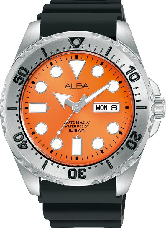 橙色錶面不鏽鋼錶殼及透視背蓋黑色矽膠錶帶礦物玻璃鏡面日期及星期顯示日常生活防水(100米)錶盤直徑:44mm