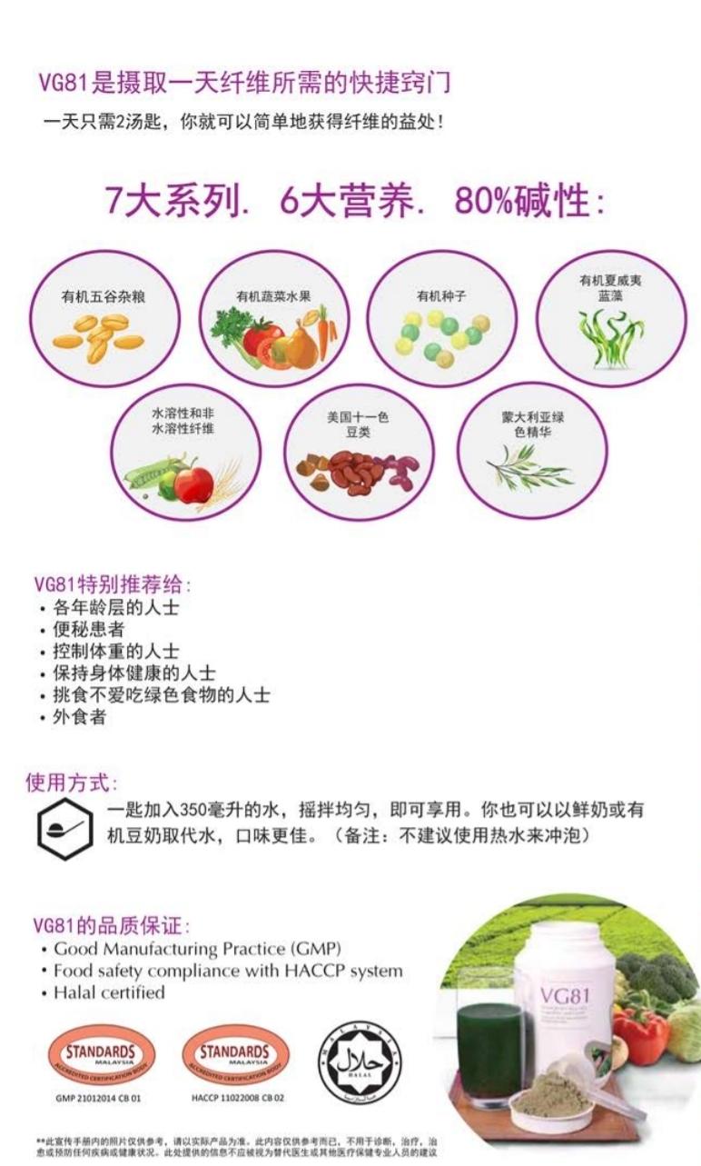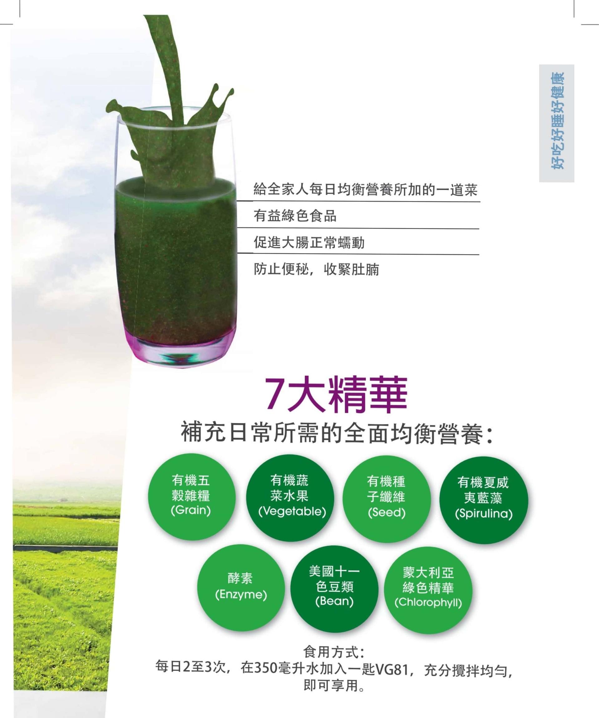 拥有7大精华的全面均衡营养素、补充 每日蔬果的摄取量、 加速肠胃蠕动 给全家人每日均衡营养所需加的一道 菜。