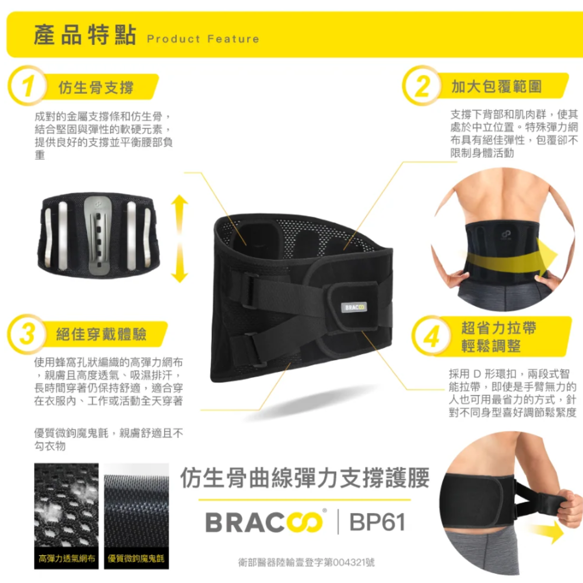 採用高透氣彈力蜂窩狀網布 絕佳貼身彈力體驗 仿生骨造型彈力支撐板 模仿人體脊椎自己曲線 覆蓋面積可到L4-L5脊椎位置 兩段式拉帶 省力調節