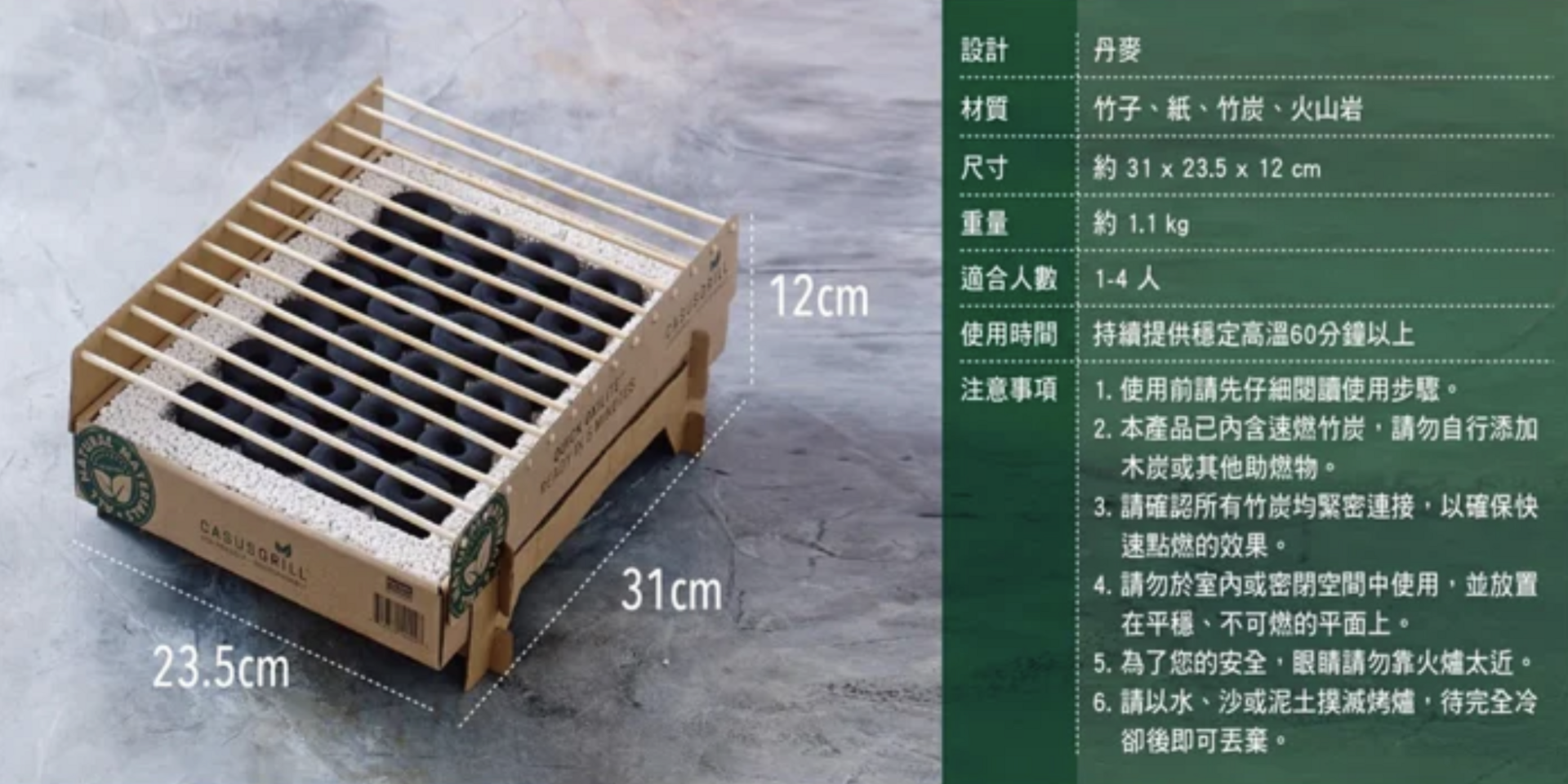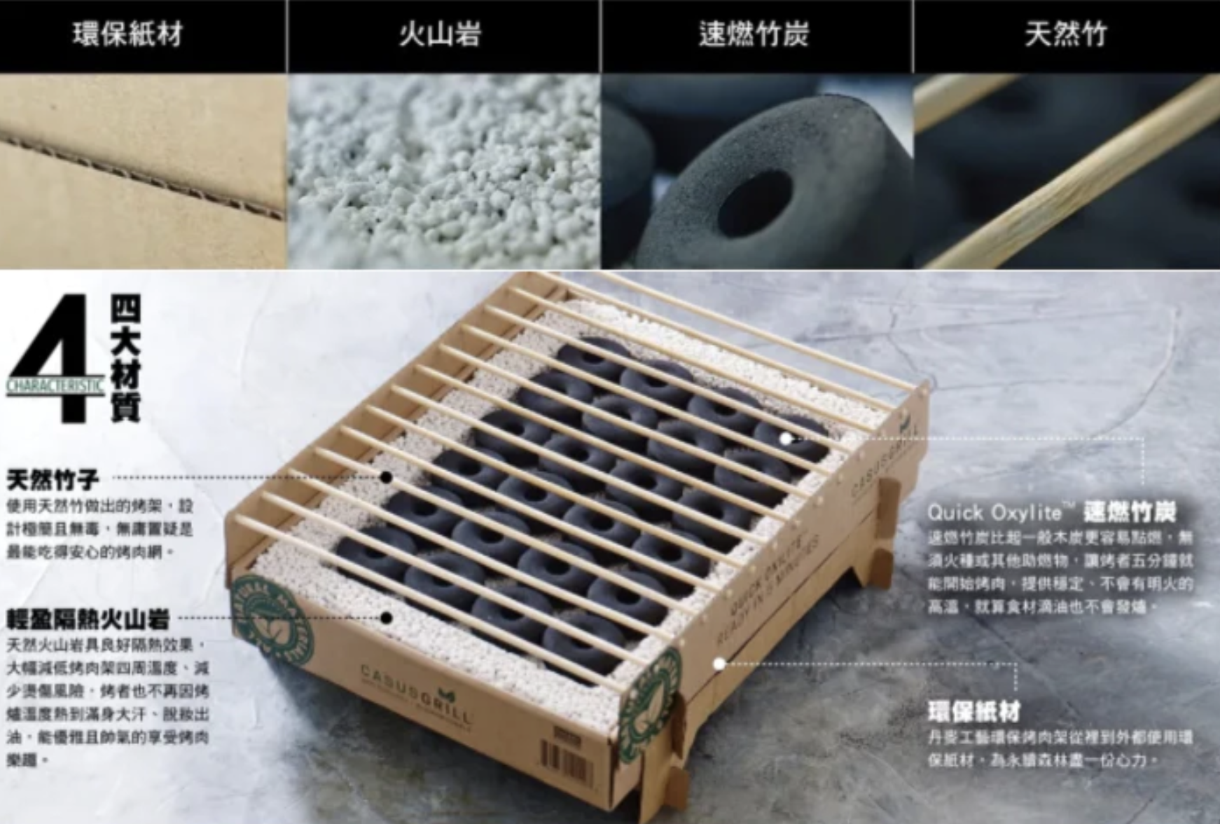 物料:竹子、環保紙材、Quick Oxylite™速燃竹炭、火山岩