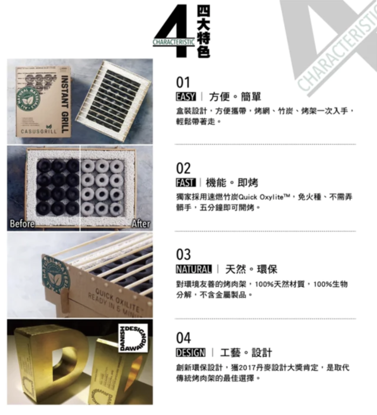 - 獨家採用速燒竹炭Quick Oxylite™,免火種、不需弄髒手