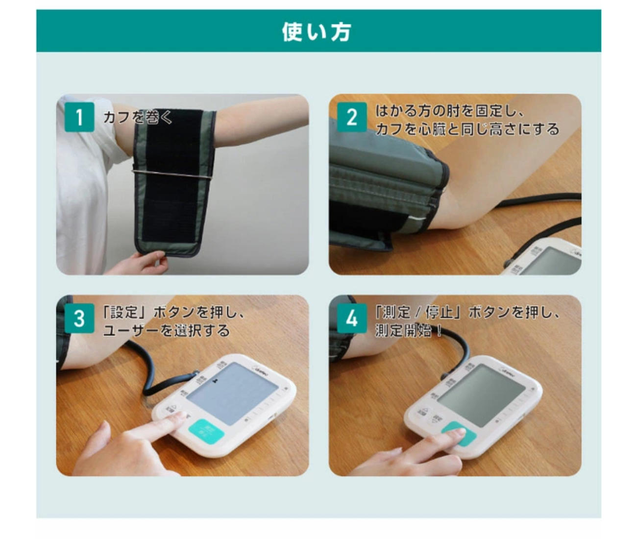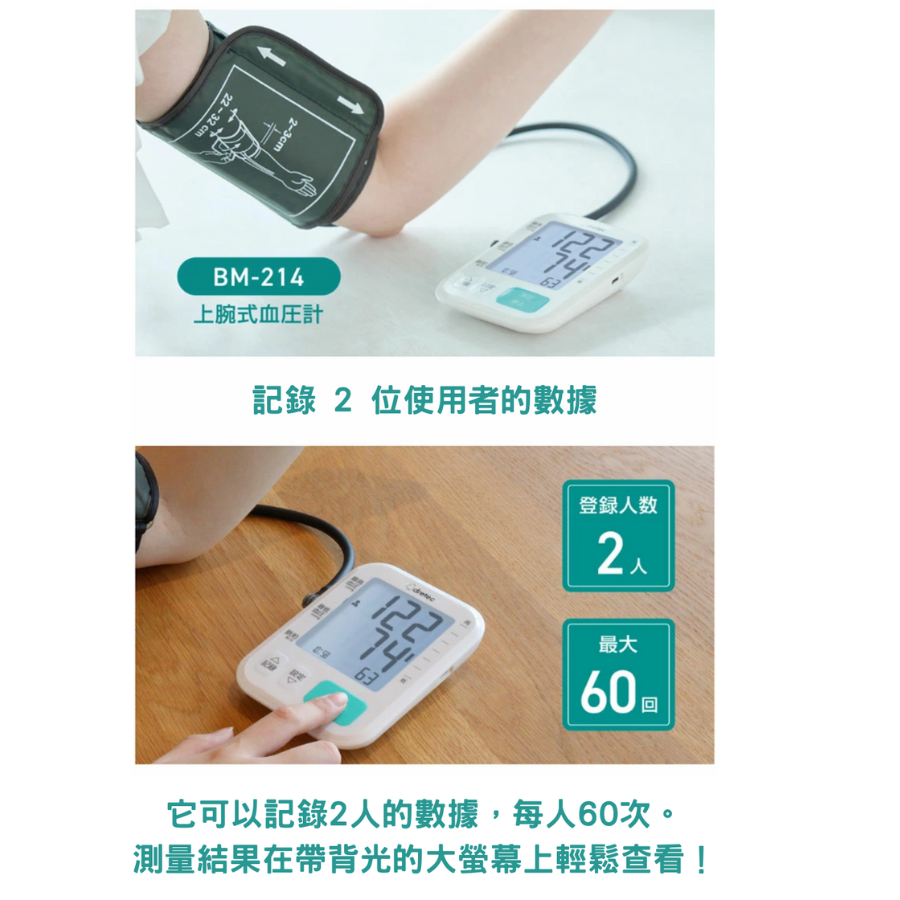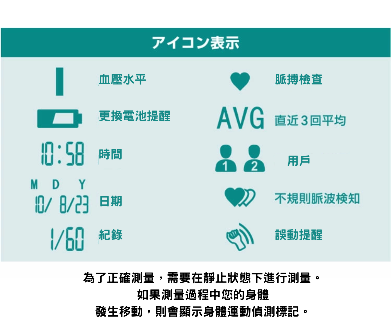 ・記錄2人的測量結果(2人×60次) ・小巧但大螢幕 ・顯示 6 級血壓水平 ・背光 ・顯示最近 3 次測量的平均值 • 配備人體運動偵測功能/脈搏偵測功能 - 電池更換通知 ・方便的日期和時間顯示 電池式或斗連表接USB使用 (內附USB線) 日本醫療器械註冊號: 305AKBZX00041000