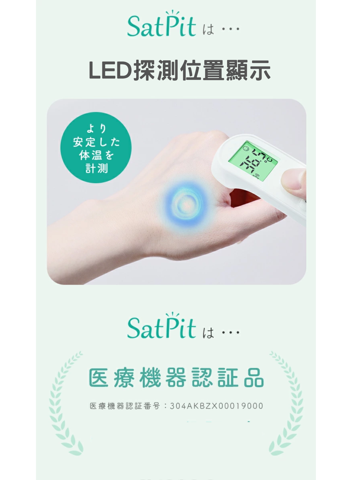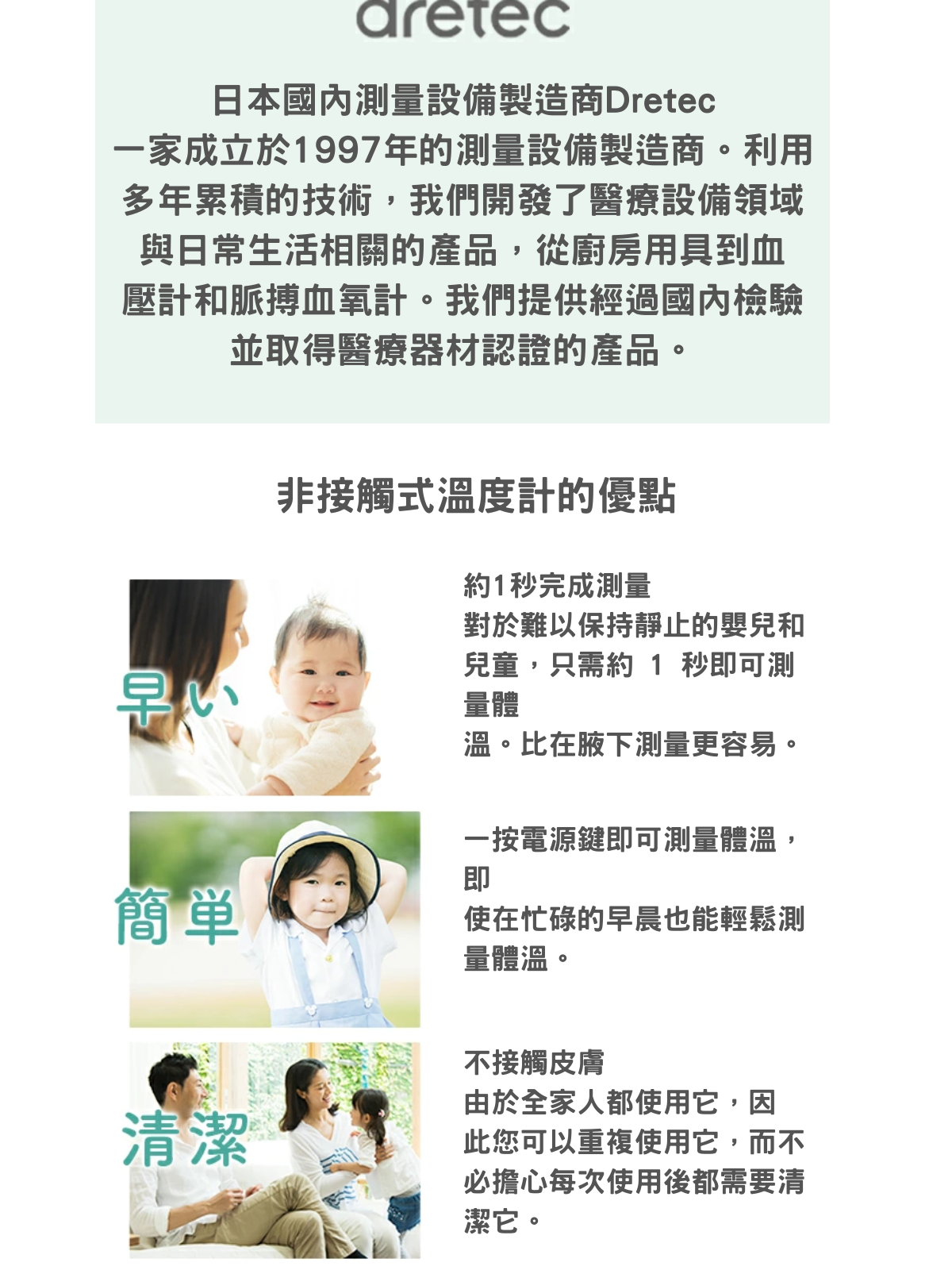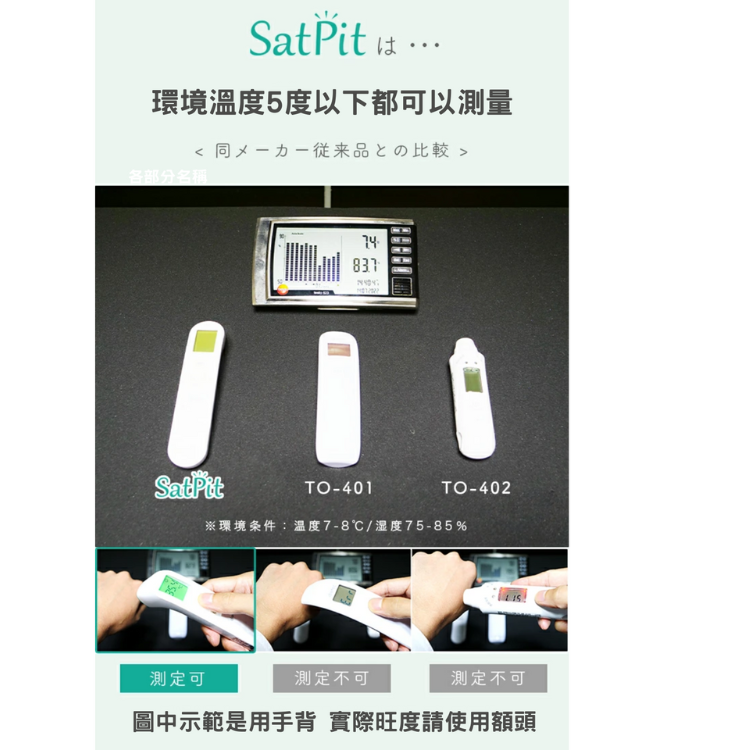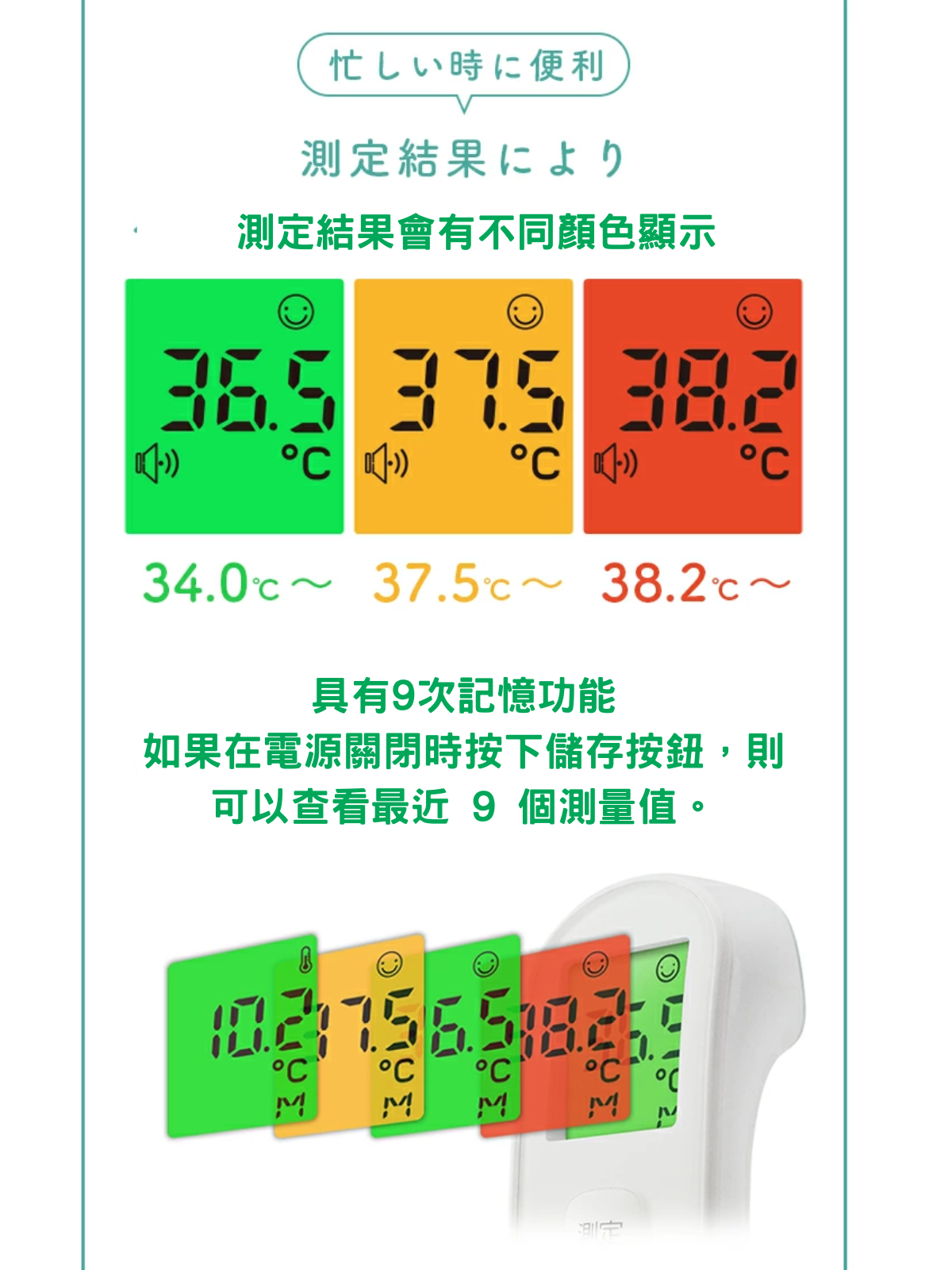 採用日本品牌感測器 非接觸式測量 大約 1 秒鐘即可完成測量 配備 LED 燈,輕鬆查看測量位置 體溫及物體測量兩用 3個顏色顯示溫度結果 9個測量結果顯示 日本醫療器械註冊