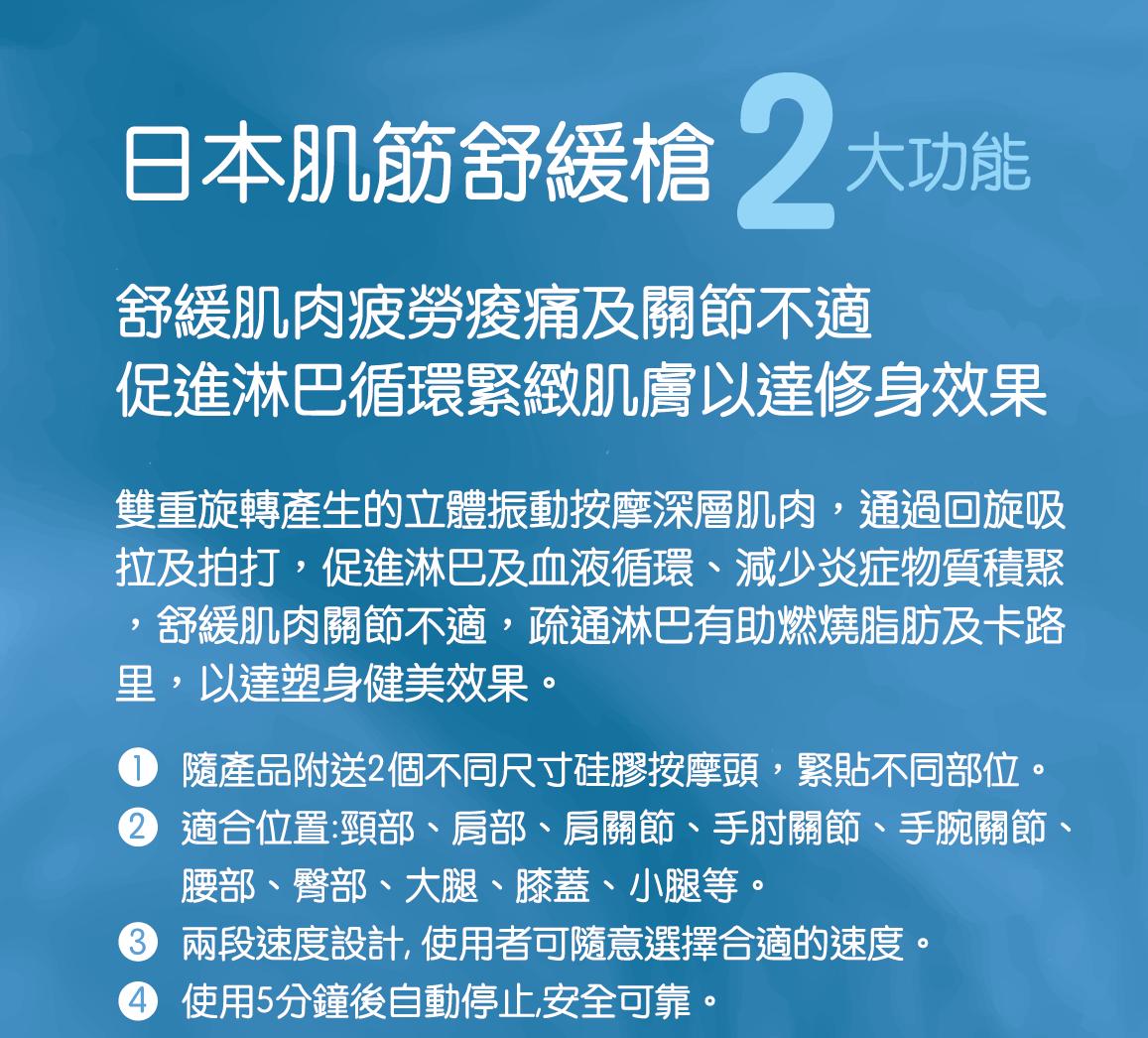 具有2段速度調節, 及2個不同尺寸的硅膠按摩吸盤, 適合用於身體不同部位。 輸入: 110-240VAC, 50/60 HZ X0.4A 輸出: 12VDC X 1.0A 日本品牌肌筋舒緩槍使用創新人體工學設計功能吸盤,以每分鐘旋轉1000-1300轉, 通過回旋吸拉及拍打(Elastic Recoil Effect) 能輕輕提起皮膚表面, 尤如拔罐的「閃罐」法原理令肌肉放鬆,以增加皮下組織空間,促進淋巴及血液循環、減少炎症物質積聚,達致消腫、去瘀及舒緩肌肉關節不適功效。