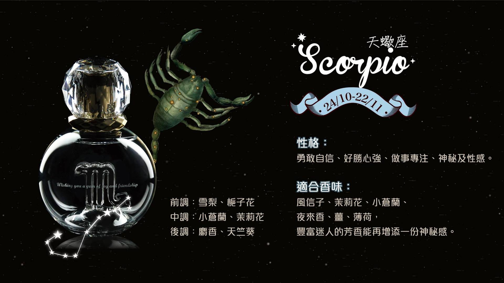 天蠍座勇敢自信、好勝心強、做事專注、神秘及性感。豐富迷人的芳香能再增添一份神秘感。
