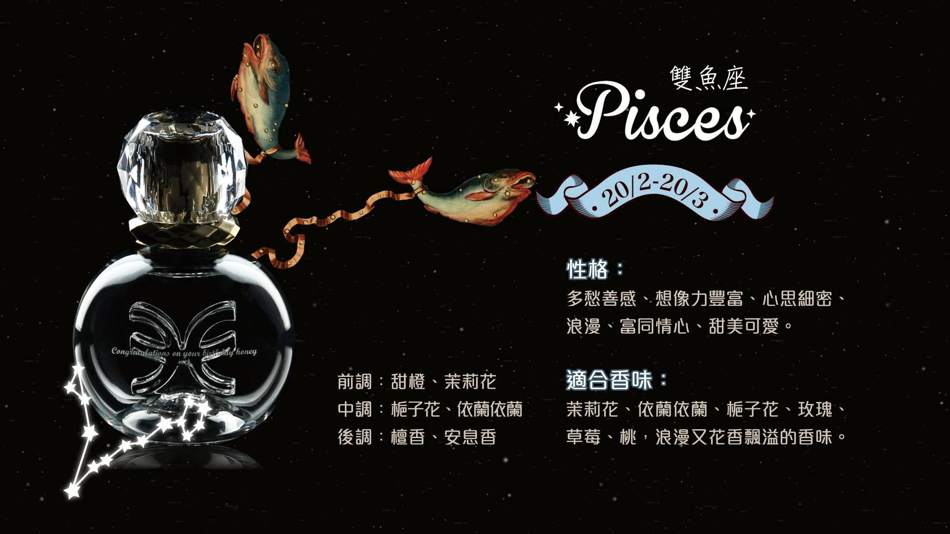 雙魚座性格多愁善感、想像力豐富、心思細密、浪漫、富同情心、甜美可愛。適合浪漫又花香飄溢的香味。