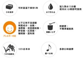 日本Onisi -為日本各地作為備用的緊急食品,食材經冷凍乾燥處理,可存放達五年,同時保持美味 -尾西的飯類即食食品於艱難條件下仍可有柔軟可口的米飯可享用 -只需加入調味料(如有)及熱水/冷水即可食用(熱水15分鐘、冷水1小時) (不同產品的製作方法及時間或有差異,詳見產品包裝) -飯類即食食品使用100%日本米、日本食材,口味選擇多樣,美味安心 -超輕量包裝,方便攜帶及存放