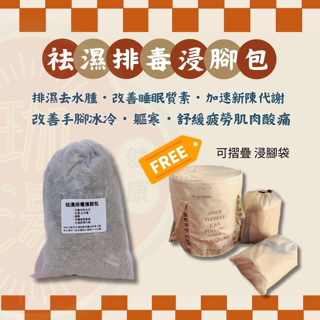 【祛濕排毒足浴包】12包 另附送 可摺疊 浸腳袋一個 香港人緊張的生活節奏,而且天氣潮濕。 身體代謝不掉的廢物會累積成為血瘀,導致肌肉痠痛和頸緊膊痛。 每晚睡前浸一浸,排掉毒素,消除疲勞,祛除濕氣,特別好瞓。 特別適合:容易覺得疲倦、四肢沉重、沒有食慾、身體浮腫人仕使用。 ・排走濕氣,去水腫,軀寒 ・改善手腳冰冷 ・舒緩疲勞、改善睡眠質素 ・加速新陳代謝 ・舒緩肌肉酸痛 主要成份:桑枝,桂枝,紅花,雞血藤,王不留,女貞子,乾薑,益母草,艾葉 使用方法: 1. 將一包浴包放入攝氏約40度溫熱水,水位高度在離腳面上約十厘米,等待5分鐘。 2. 開始浸泡腳部20-30分鐘,身體會輕微出汗。 3. 可在水溫下降時,加入熱水2-3次,延續浸泡時間。 4. 完成浸泡後用毛巾擦乾雙腳,注意保暖。