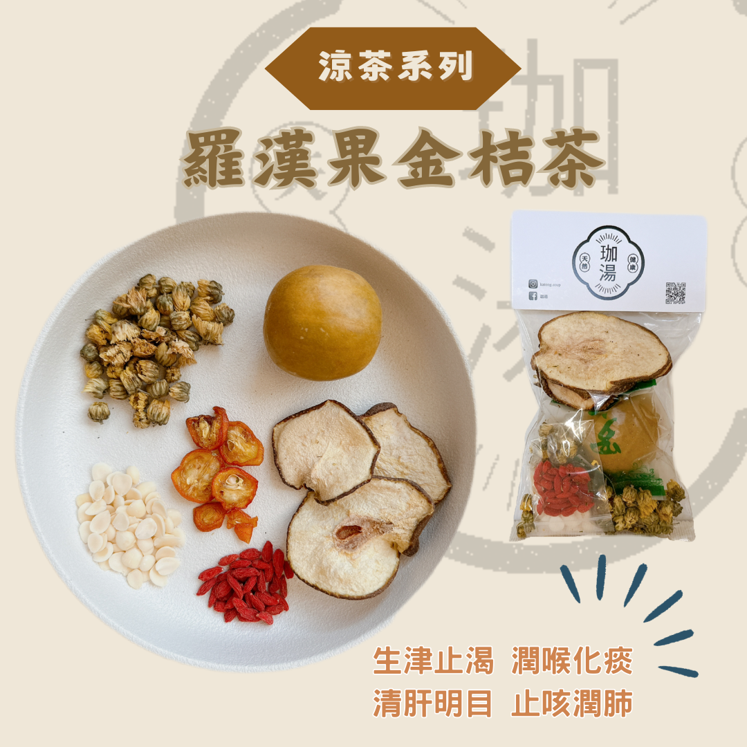 【羅漢果金桔茶】 天氣乾燥 / 經常食煎炸野 間中飲下。清熱潤喉止咳 ・生津止渴 ・潤喉化痰 ・清肝明目 ・止咳潤肺 材料:羅漢果,雪梨乾,柑桔,杏仁,菊花,杞子 -羅漢果 對付喉嚨痛及預防咽喉炎的良藥 -雪梨乾 清熱化痰、治風熱、降火止渴、解毒、滋潤肌膚和喉嚨 -柑桔 止咳化痰 開胃生津 -杏仁 去痰、止咳、潤肺、平喘 做法: 1.清洗所有材料 (羅漢果茶可以落半個) 2.加入約2升水 3.大火滾起轉細火煲45分鐘或可養生壺煮