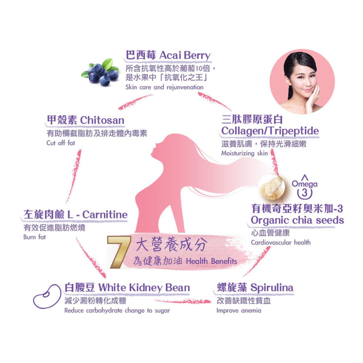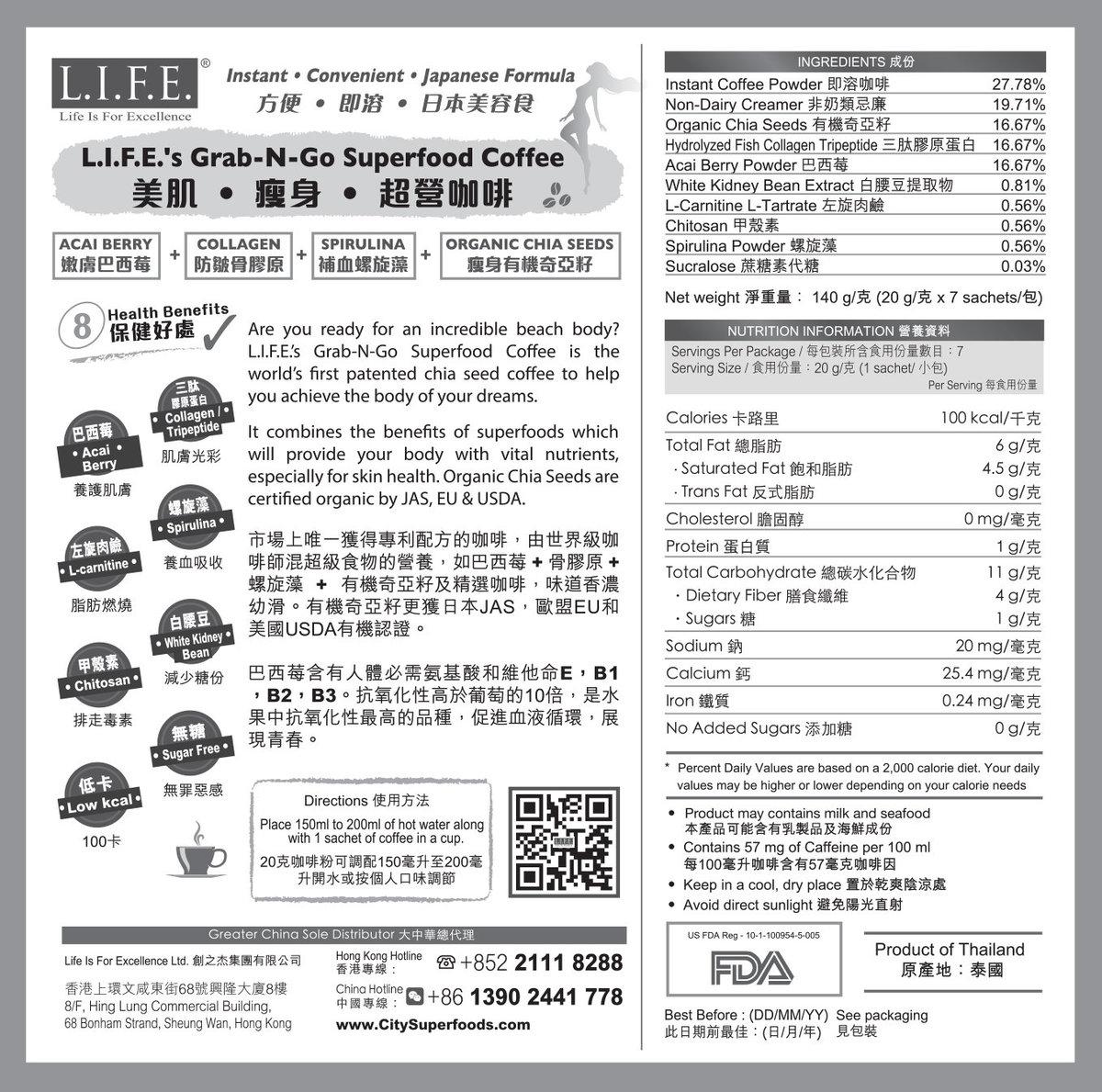 即溶咖啡、非奶類忌廉、有機奇亞籽、三肽膠原蛋白、巴西莓、白腰豆提取物、左旋肉鹼、甲殼素、螺旋藻、蔗糖素代糖