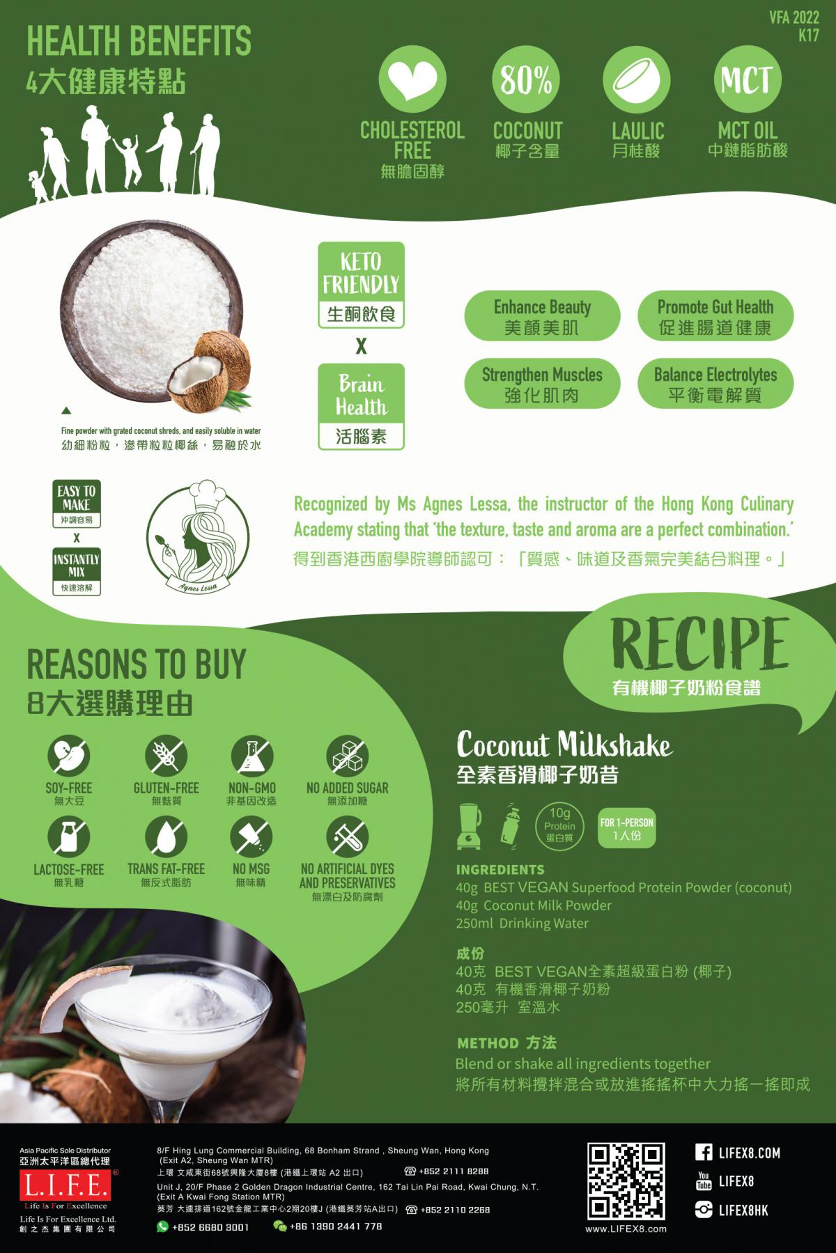 椰子奶含有豐富的中鏈甘油三酸酯, 是無膽固醇健康脂肪。它有效延長飽腹感,其脂肪更可被轉化為能量,於體內作脂肪酸代謝功能。