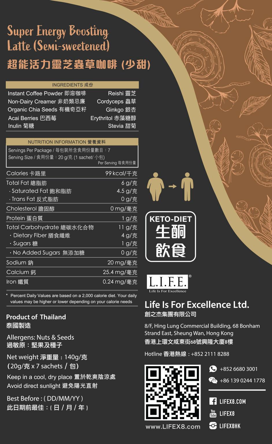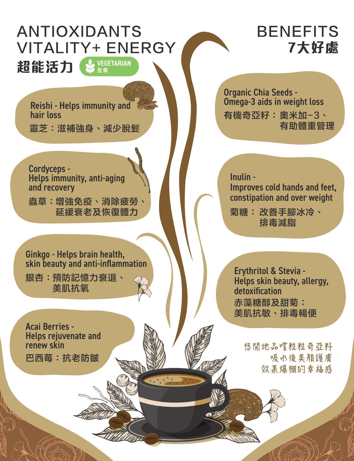 超能活力靈芝蟲草咖啡??市場上唯一獲得專利配方的咖啡,由世界級咖啡師混合超級食物的營養,如巴西莓 + 靈芝 + 蟲草 + 銀杏 + 有機奇亞籽及精選咖啡,味道香濃幼滑。有機奇亞籽更獲日本JAS,歐盟EU和美國USDA有機認證。??好處?靈芝 - 滋補強身、減少脫髮?蟲草 - 增強免疫、消除疲勞、延緩衰老及恢復體力?銀杏 - 預防記憶力衰退、美肌抗氧?有幾奇亞籽 - 奧米加-3、有助體重管理?巴西莓 - 抗老防皺?菊糖 - 改善手腳冰冷、排毒減脂??「悠閒地品嚐粒粒奇亞籽吸水後美顏護膚效果爆棚的幸福感~」?-??沖泡方式?熱飲 -?1. 取出一包倒入杯中?2. 注入150毫升熱水?3. 攪拌均勻即可享用??凍飲 -?1. 取出一包倒入杯中?2. 注入100毫升熱水?3. 攪拌均勻?4. 加入冷水或冰塊?