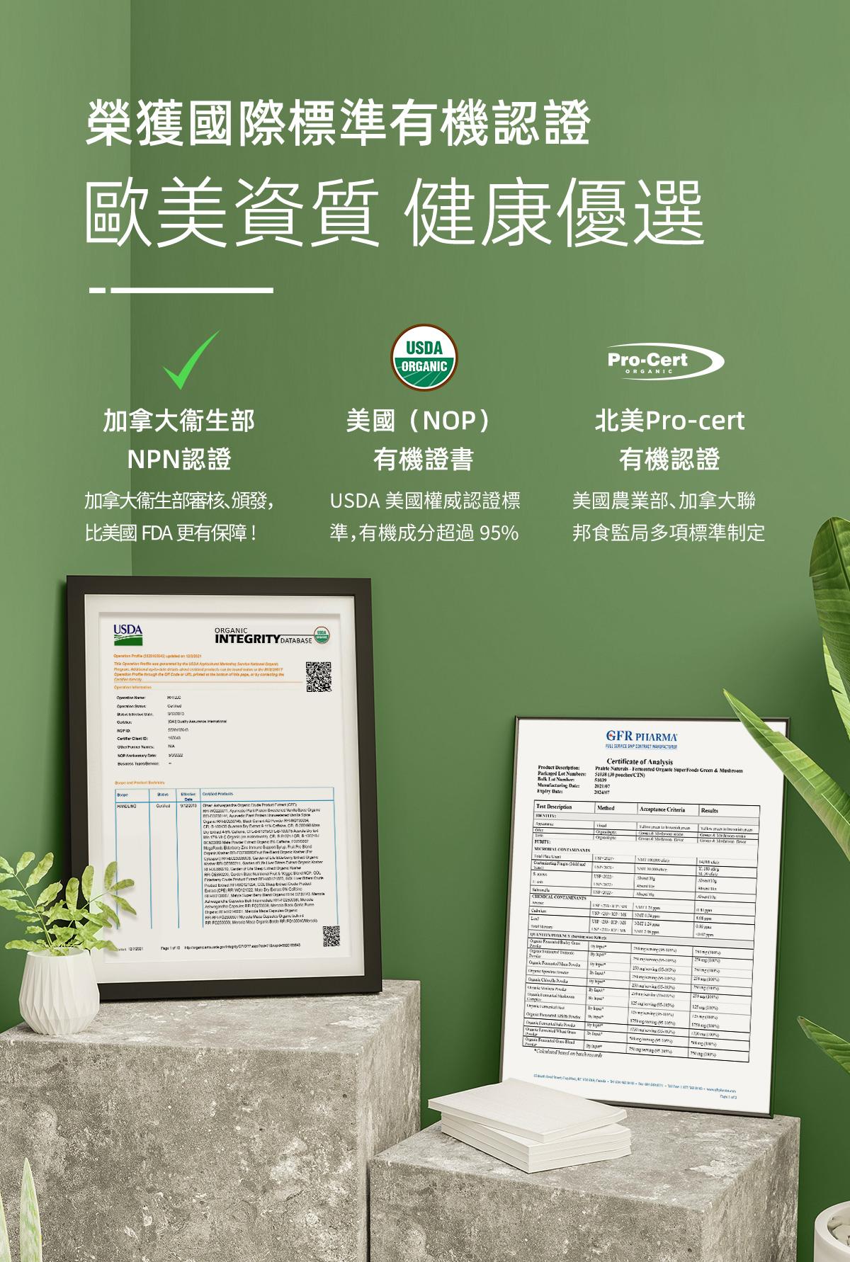 USDA有機認證,相對市面聲稱有機食品質量及營養更有保證。 蘊含20種有機超級食物 羽衣甘藍、紫花苜蓿、辣木葉、大麥草、小麥草、燕麥草、小球藻、螺旋藻、瑪卡、薑黃、藍莓、紅菜頭、冬蟲夏草、靈芝、雲芝、牛樟芝、姬松茸、灰樹花、杏鮑菇、猴頭菇。 • 提高身體鹼性,增強免疫能力 • 保護腸道健康,排毒纖體瘦身 • 促進皮膚細胞修復,緊緻肌膚 • 清除自由基,調節體質抗衰老 • 改善三高問題,預防骨質疏鬆 • 有機發酵技術,更易人體吸收