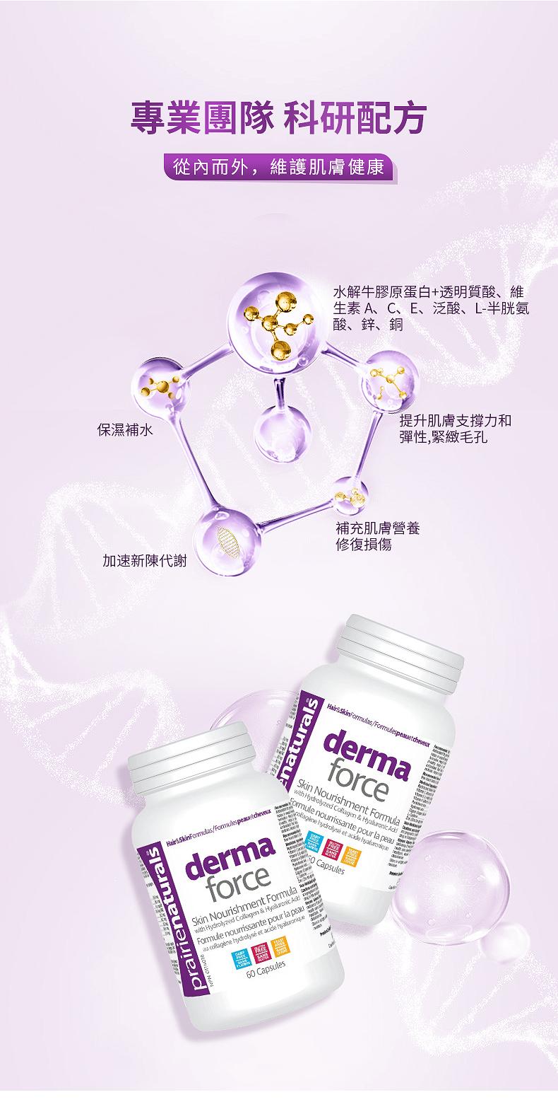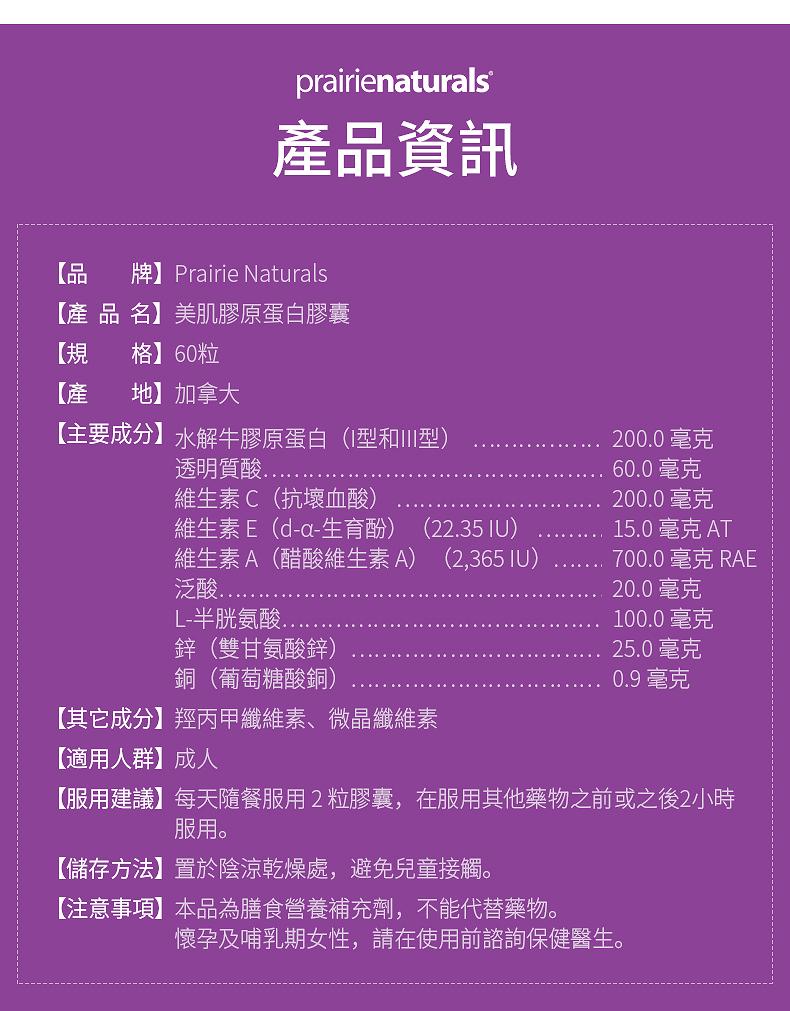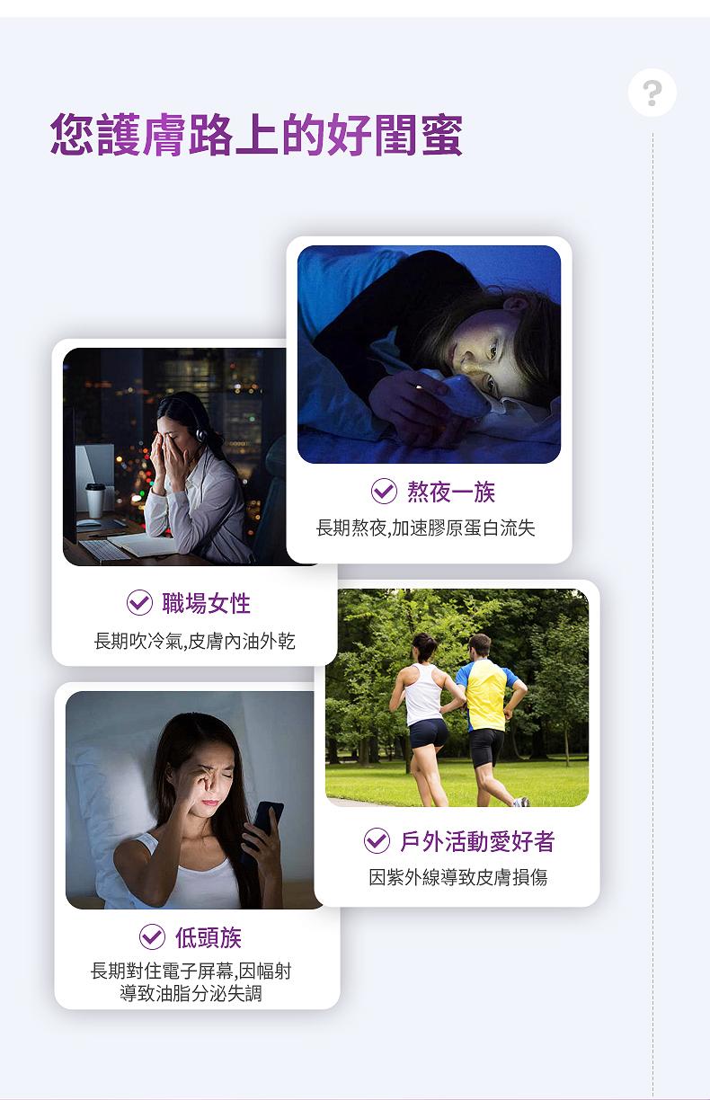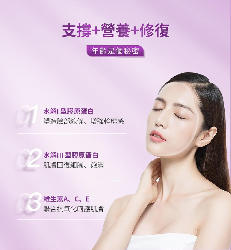 含I 型 III 型膠原蛋白及保濕透明質酸含抗氧化維生素 A、C 和 E 以及泛酸促進膠原蛋白形成提升皮膚彈性