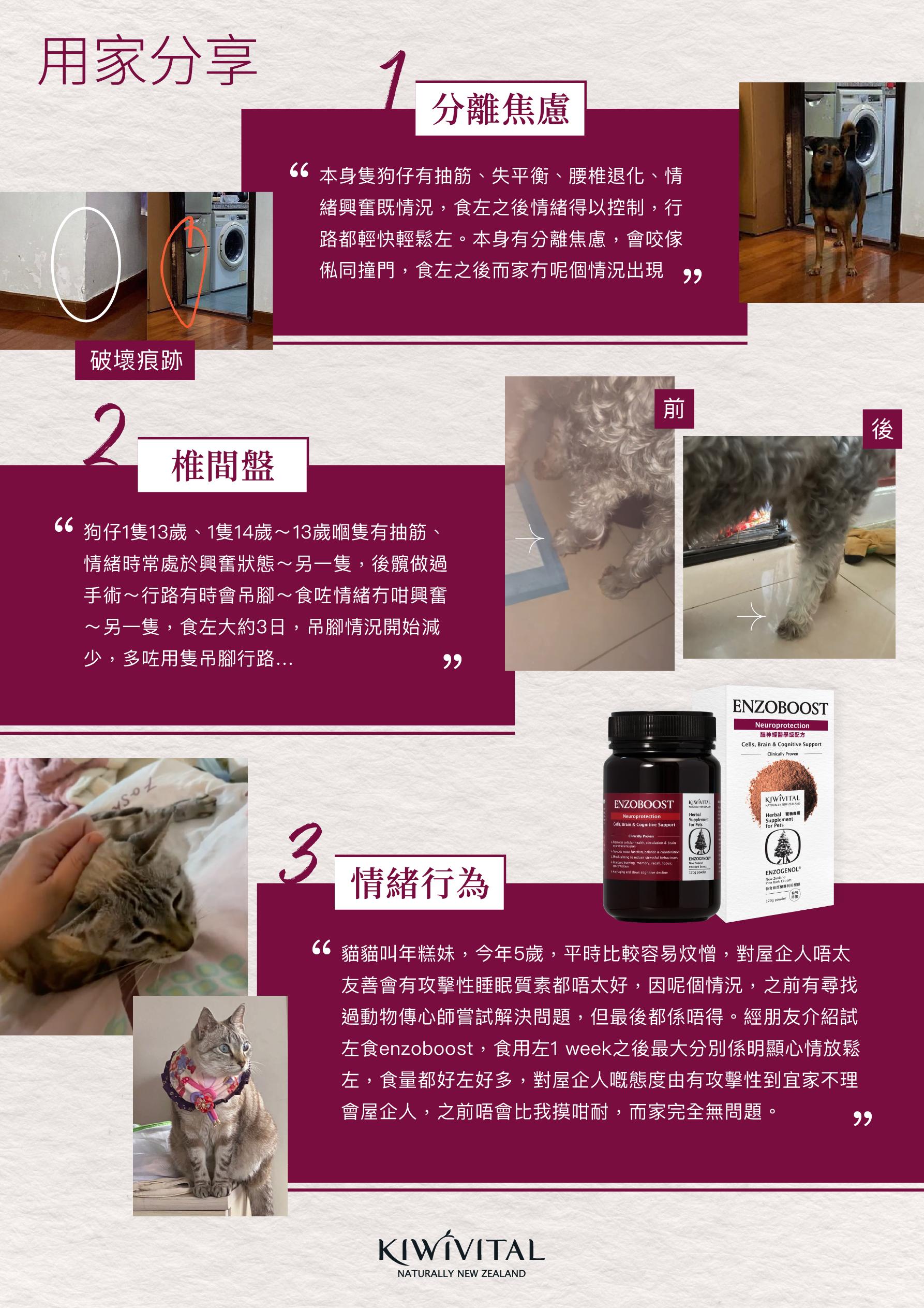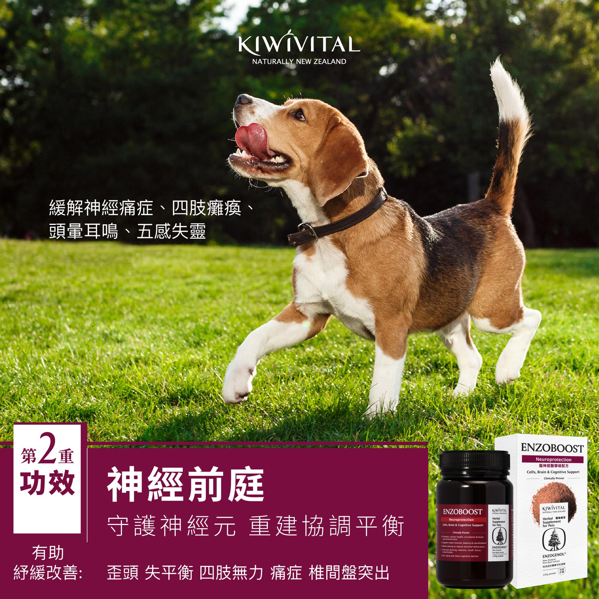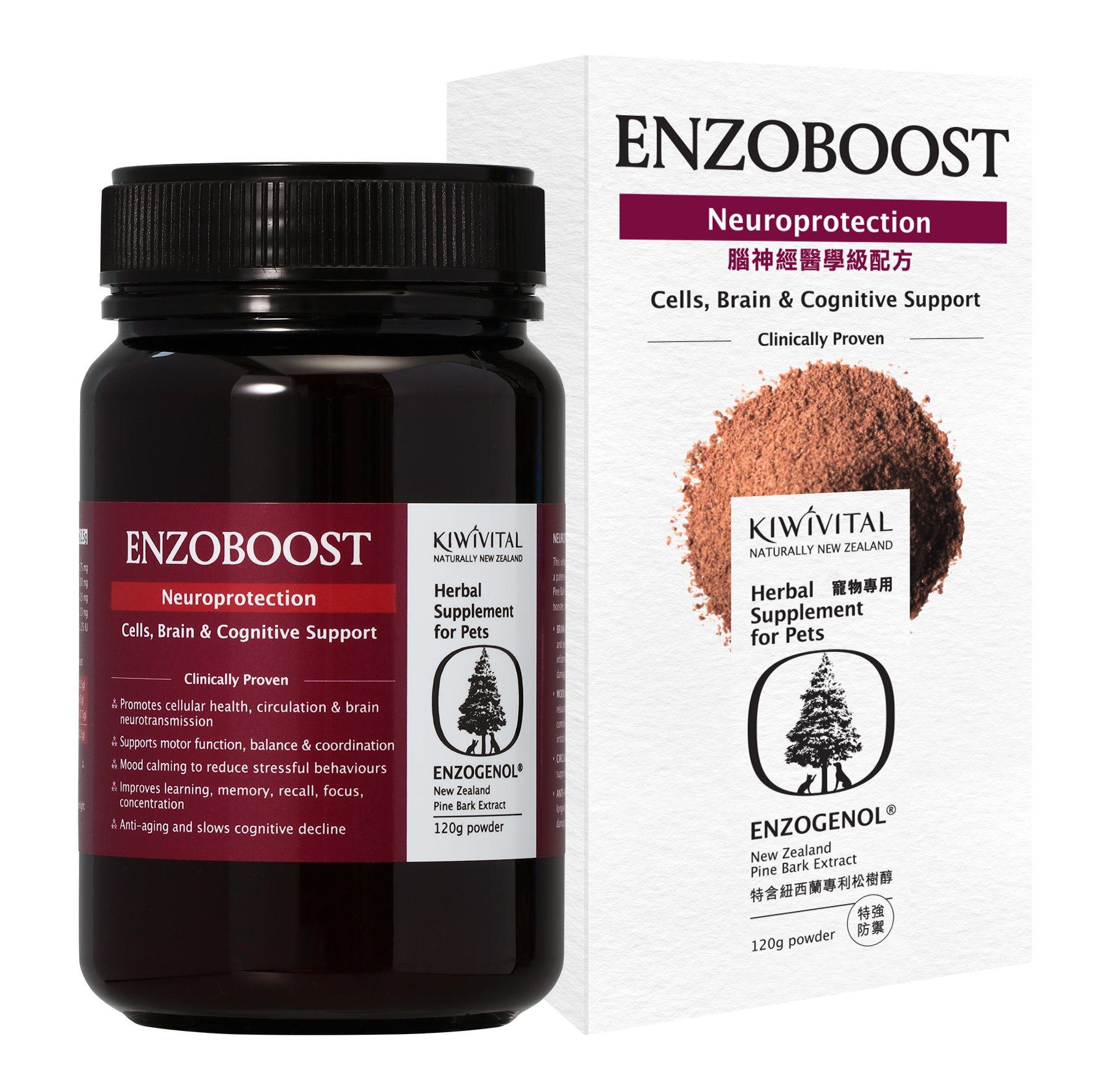 寵物腦神經受損,影響協調及活動力 EnzoBoost 腦神經醫學級配方,特含專利「Enzogenol®松樹醇」 ,產品採用紐西蘭火山士域野生生長的松樹皮,配合專利純水技術萃取。有效修復神經元、細胞防禦、及促進血液微循環,重建「腦·脊·肌」訊息傳遞。 臨床證明3重功效 : 第1重功效: 大腦認知 -- 細胞防禦,逆轉腦齡創傷 超微細分子,有效穿透血腦屏障直達腦部,激活腦細胞,修復漸進式的腦部及記憶衰退。配方更有效改善大腦血流量,抑制有害蛋白及腦部氧化。透過修復大腦神經訊息傳遞,針對預防改善因腦部受損引起的疾病, 包括:腦退化、癲癇抽搐、中風、腦癌、腦積水、腦腫脹、腦炎創傷、撞擊等。 第2重功效: 神經前庭 -- 守護神經元,重建協調平衡 幫助修復受損神經元,促進神經再生,紓緩椎間盤退化及前庭反覆復發症狀,提升寵物的協調及平衡能力,舒緩神經痛症。預防多種神經系統失靈問題,包括:四肢癱瘓、肌肉無力、不能站立、單邊傾側、頭暈耳嗚及五感失靈等問題。 第3重功效: 情緒行為 -- 速效鎮靜,長效穩定改善失控異常 草療鎮靜,紓緩壓力及放鬆大腦神經。改善外來環境因素改變而引起的過分焦慮、壓力、緊張情緒。透過調節腦部訊息之間的互動及交互,長效改善過度活躍及興奮行為,幫助寵物大腦回復平靜狀態。 天然草療配方,結合多種活性成份,包括藻油DHA,L-Theanine茶胺酸及維他命B雜,協同效應鞏固腦神經系統。 無睡意,不含藥性,適合貓狗服用。 成分 松樹醇(紐西蘭松樹皮提取)/75mg、藻油DHA/500mg、茶氨酸/50 mg 、維他命B6/15mg、維他命B1/10 mg 、維他命C/13mg、維他命B3/15 mg、 維他命E/25IU、亞麻籽粉、酵母 餵食指南(服用劑量) 每日一次,按貓狗體重混合乾/濕糧餵服 (如已出現症状的貓狗,可將建議劑量提升) 犬用 20kg 3匙(7.5g) 貓用 標準 1匙(2.5g) 儲存方法:室溫及避免陽光直射,開封後3個月内使用完