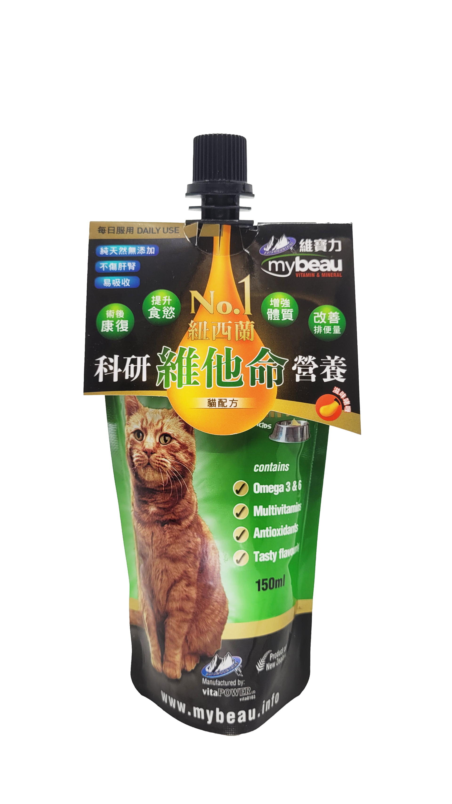 紐西蘭MYBEAU®貓用專利維他命營養啫喱 配方由紐西蘭梅西大學研發,科研營養每日提供貓咪所需維他命及礦物質。經臨床證實,全面提升貓咪65%免疫能力!有效改善貓的皮膚和毛髮、免疫力、消化及整體健康。 主要功效: - 補充每日所需營養 - 增強體質,提升免疫力 - 提升食慾 - 滋潤皮膚,改善皮毛,保持毛色光澤及亮麗 - 改善排便量 - 幫助術後康復 產品特性: 。專利認可啫喱狀吸收率達至99.5%,相比粉狀或丸劑高出10倍 。純天然無添加,不傷肝腎 。紐西蘭梅西大學Massey University專利研發 (國際專利編號:PCT/NT02/00220) 。肉汁口味,適口性高,容易餵飼,適合任何年齡貓咪 。100%紐西蘭製造,選取優質原材料 。不含任何化合物、味精及致癌物 用法和服量: 每天一次,根據貓咪重量,直接餵服或混合在乾/濕糧一起餵飼。 幼貓(12個月以下): 每日5 毫升(1茶匙) 成貓(4kg) : 每日15毫升(3茶匙) 餵食指引: 使用前請先搖晃;開封後需冷藏。 每日餵食能達至最佳效果。