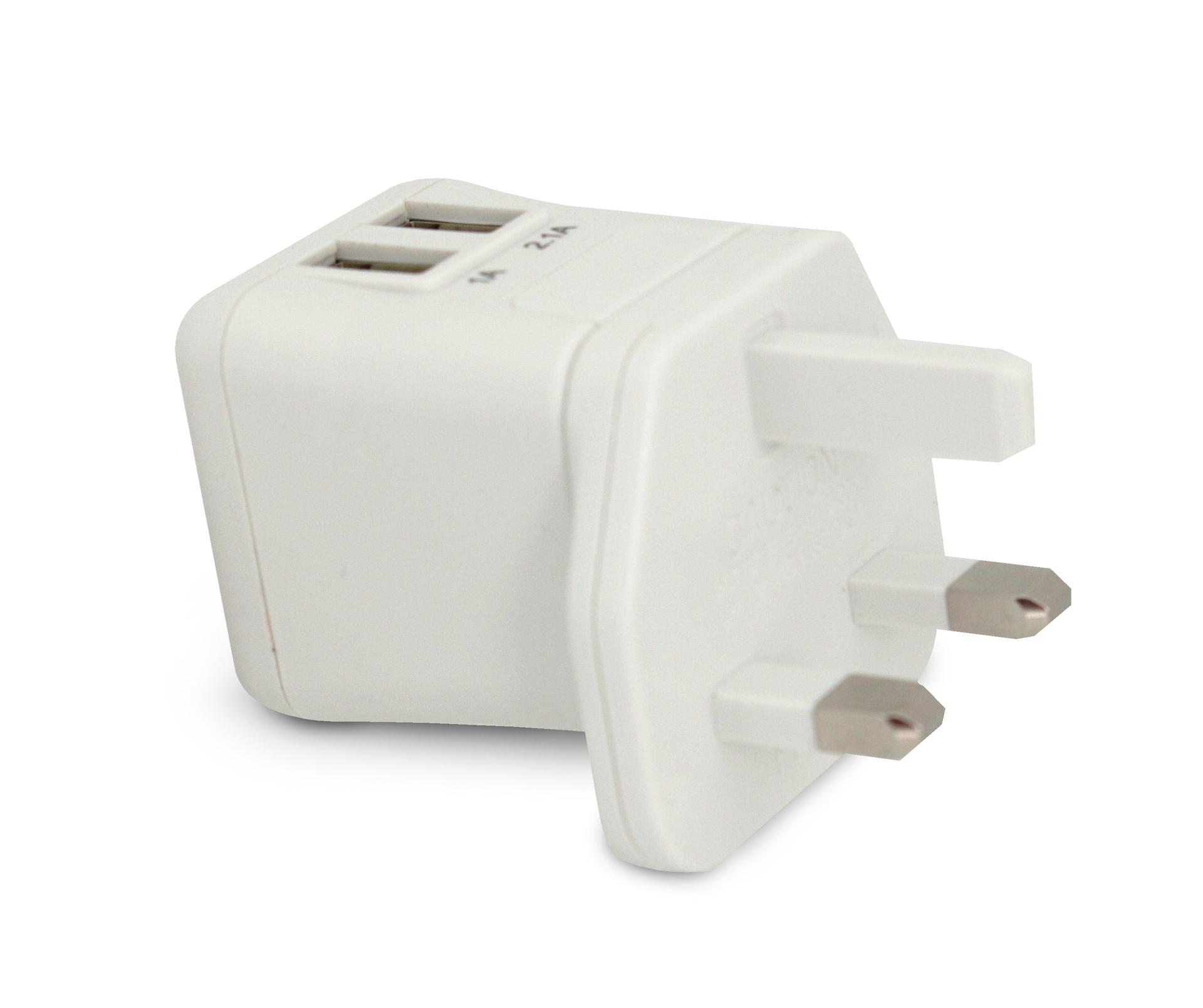 適用於超過150個國家 超小體積設計 雙USB接口, 輸出高達3.1A 折疊式兩扁插頭(US) + 3個可互換插頭 (EU, AZ, BS) 方便旅行 短路保護 過載保護 Level-VI 節能認證 UL,CE及FCC安全認證 輸入電壓: 100-240Vac 輸出功率: 15.5W USB輸出: 5Vdc, 2100mA + 1000mA 主體尺寸: 38 x 38 x39.5mm 保養服務: 獎勵備有1年香港的保養服務。請電郵至cs@everlong.biz聯絡Everlong Marketing Limited,查詢產品保養詳情及維修事宜。