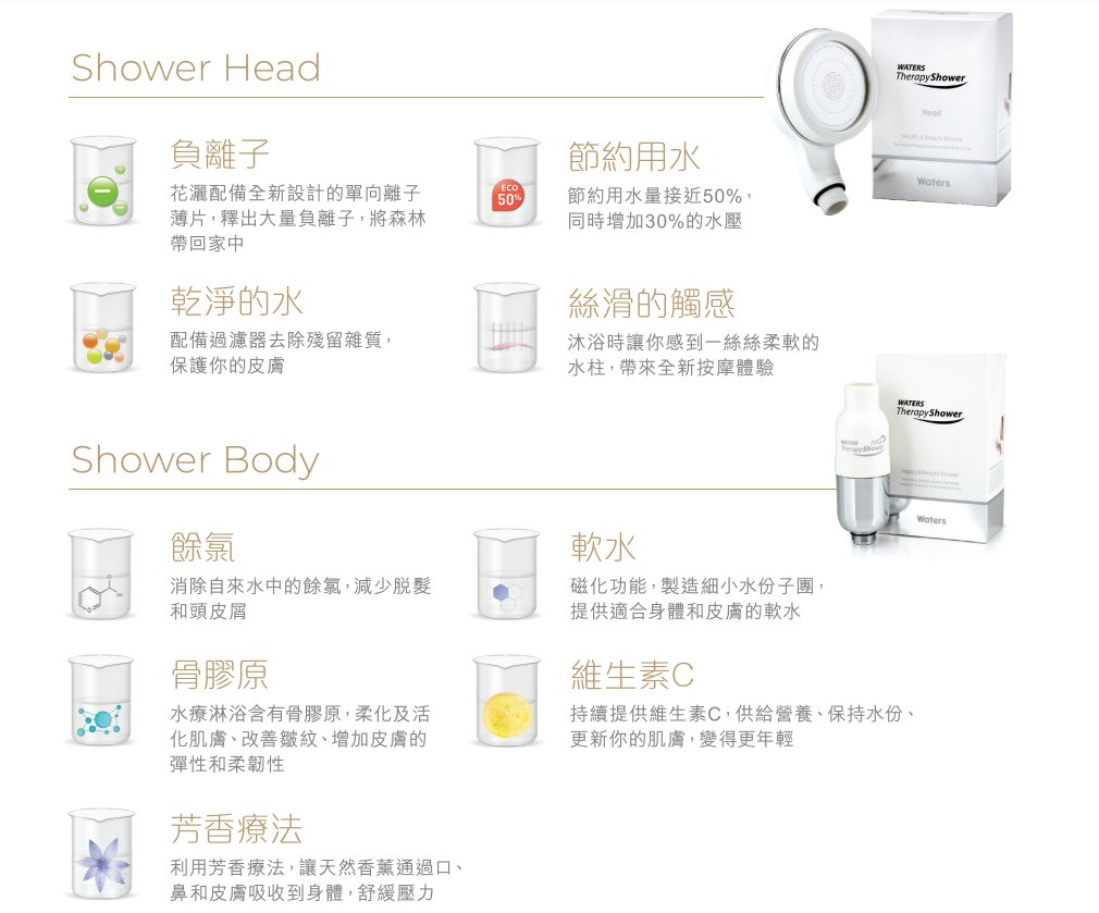 1) 首先將水中的氯氣和一些有害物質去除,這些都是導致濕疹發作、皮膚敏感和脫髮的致敏源頭。