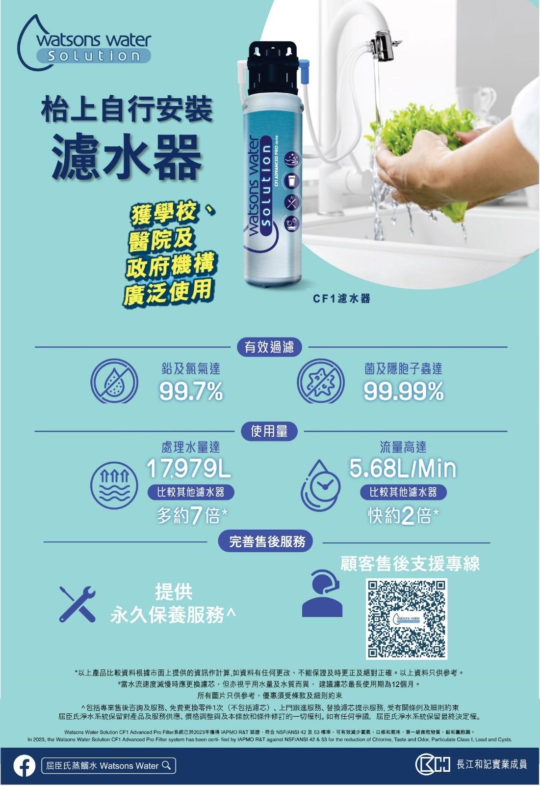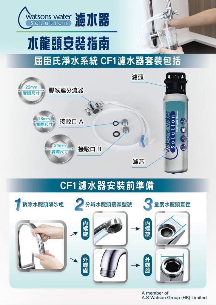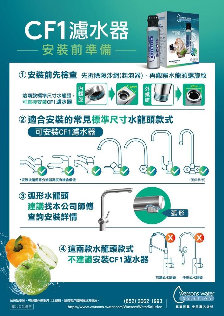 CF1 家用濾水器可自行安裝,簡單方便。濾頭設計可貼於牆身 / 掛於架上,節省枱面的位置