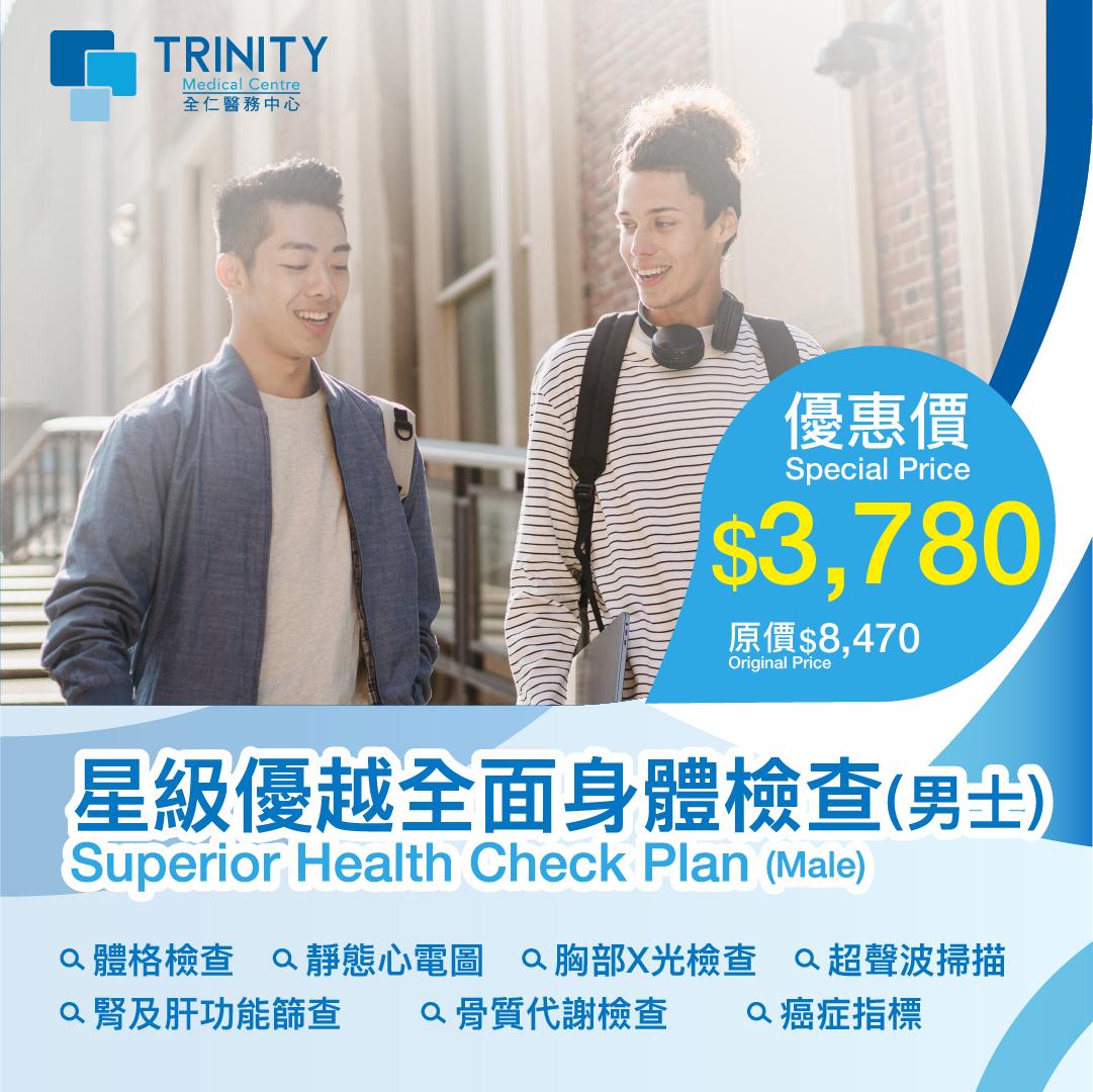 星级优越全面身体检查 (男士) 适合30岁或以上男士。助你了解体内各项机能表现,持续观察如三高、糖尿及心血管健康指数。 更特别针对男士前列腺及肾脏健康,助你及早发现相关病症作出预防或治疗。亦针对骨质疏鬆及各项癌症进行风险评估。