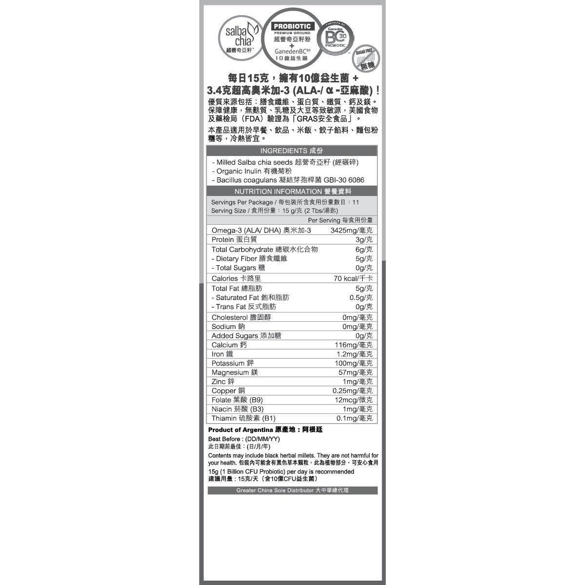 {10亿益生菌} BC30 x Salba Chia 超营奇亚籽粉 •特高 奥米加3 (合生元)