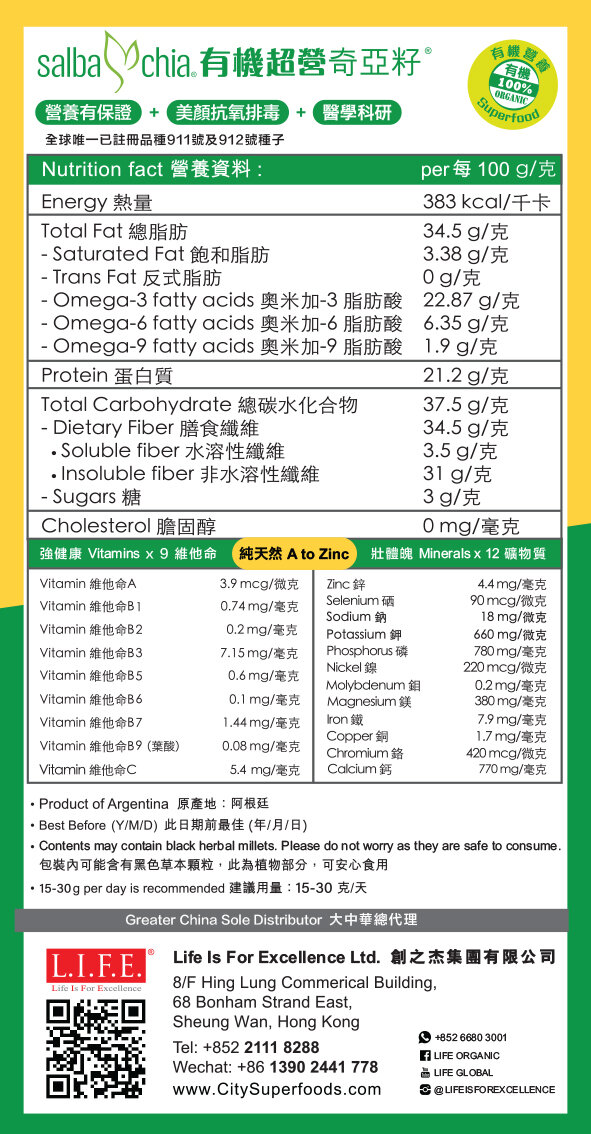 有机超营奇亚籽是来自阿根廷的鼠尾草种子。它获得加拿大多伦多大学医学院临床医学使用,每年只採摘两次成熟的种子(全球唯一有註册的#911号、#912号),保证质量。经美国及日本验证,奥米加-3之王 (α-亚麻酸)含量比其他品种高达30%*,对身体具消炎及抗衰老作用,促进小朋友脑部发育。