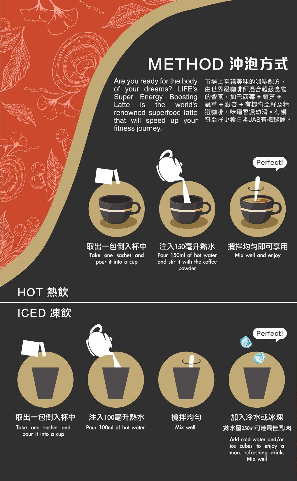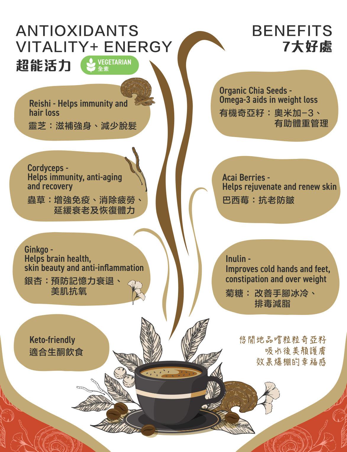 市场上唯一获得专利配方的咖啡,由世界级咖啡师混合超级食物的营养,如巴西莓 + 灵芝 + 虫草 + 银杏 + 有机奇亚籽及精选咖啡,味道香浓幼滑。有机奇亚籽更获日本JAS,欧盟EU和美国USDA有机认证。