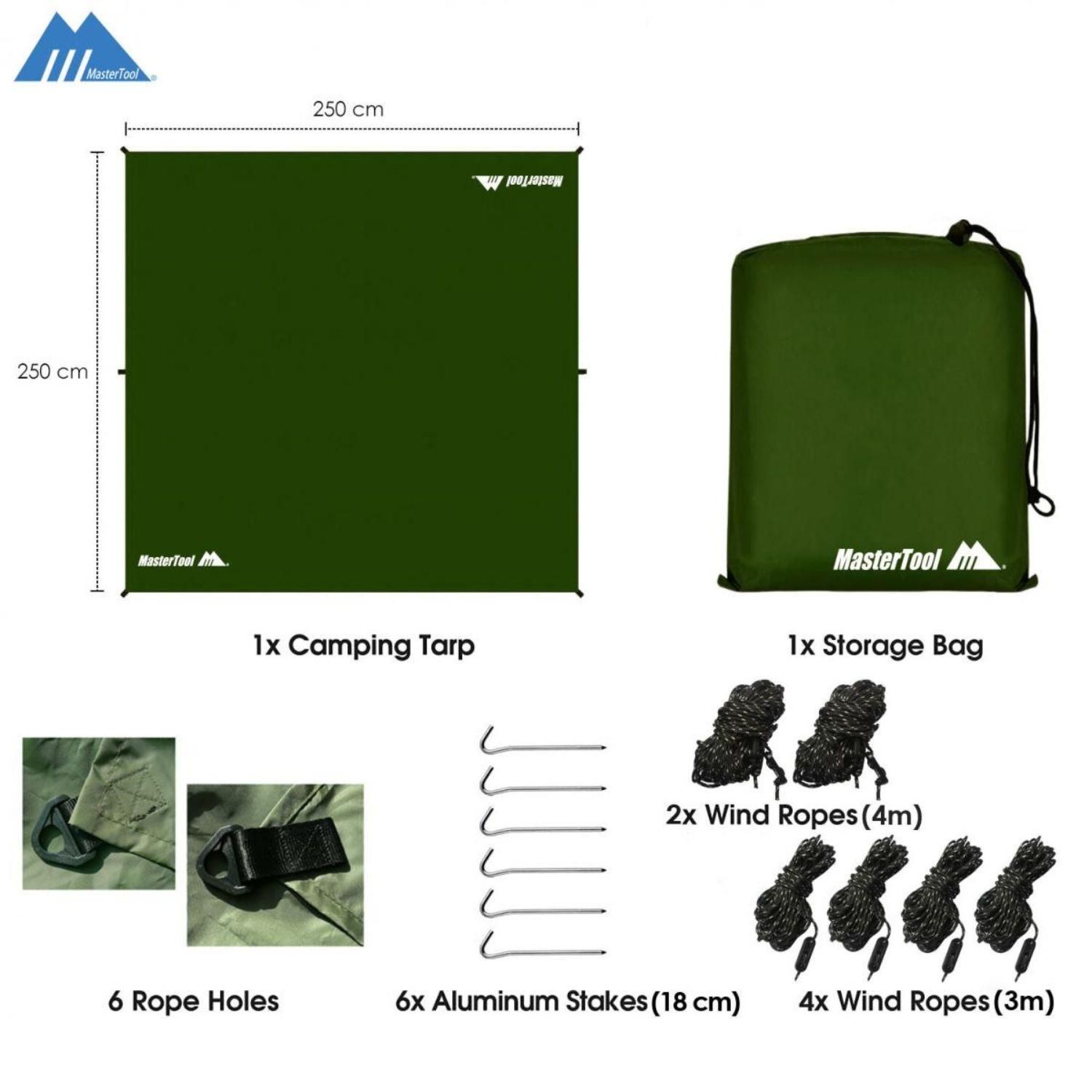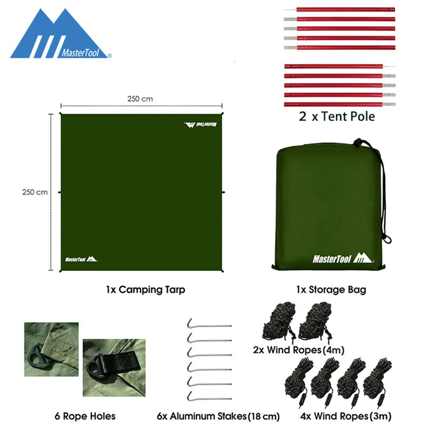 • 天幕套装内容: 收纳袋 x 1, 天幕 x 1, 防风绳(4米x 2 , 3米x 4) , 风绳扣 x 6, 地钉 x 6, 支撑竿 x 2(单支总长1950mm) • 天幕尺寸:250x250cm • 支撑杆尺寸:1950mm • 天幕+帐篷杆重量:1580g • 天幕重量:650g • 2pcs帐篷杆重量:930g