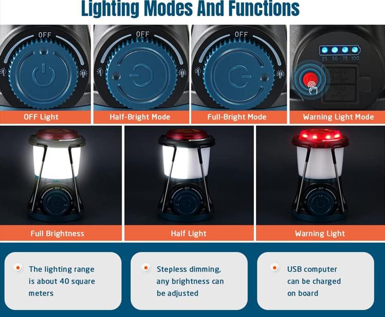 *3种灯光模式:我们的 Led 露营灯具有以下模式:逆时针旋转开/关按钮 90°,左半边灯亮; 顺时针旋转90°,全灯亮:按下背面红色按钮,红色警示灯闪烁,电池指示灯亮。