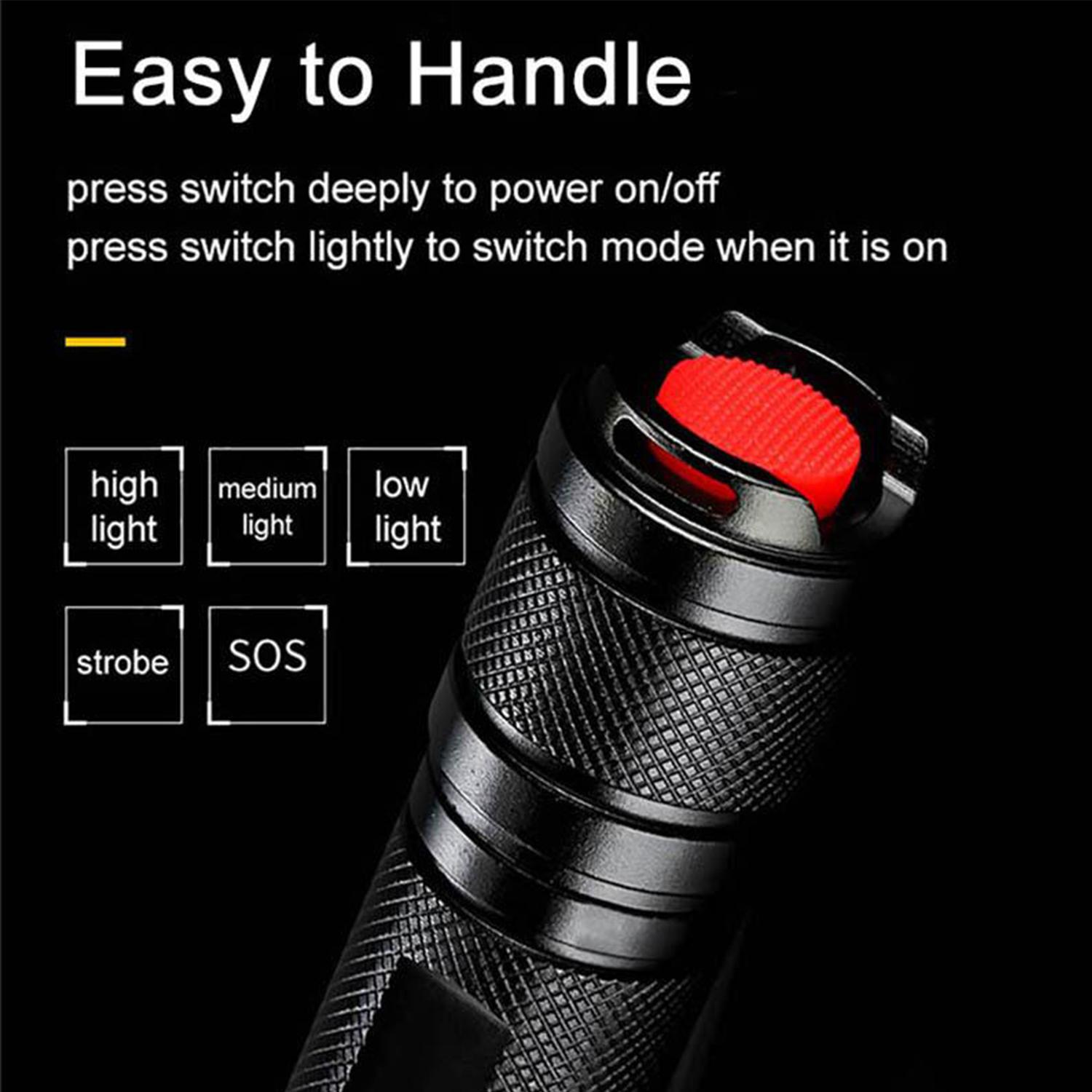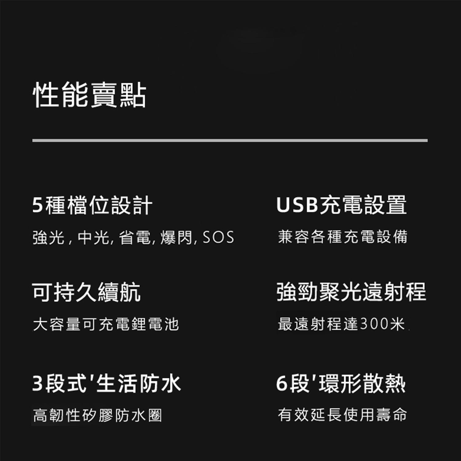 *照明模式:5种(强光,中光,省电,爆闪,SOS),客户可以透过轻按开关键切换照明模式