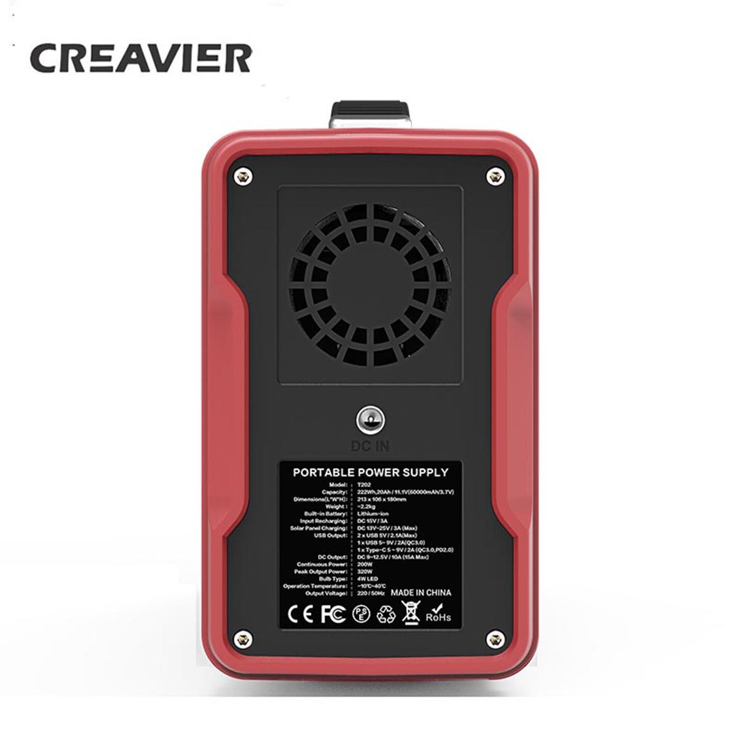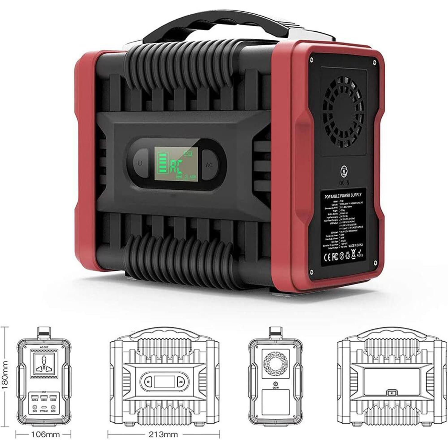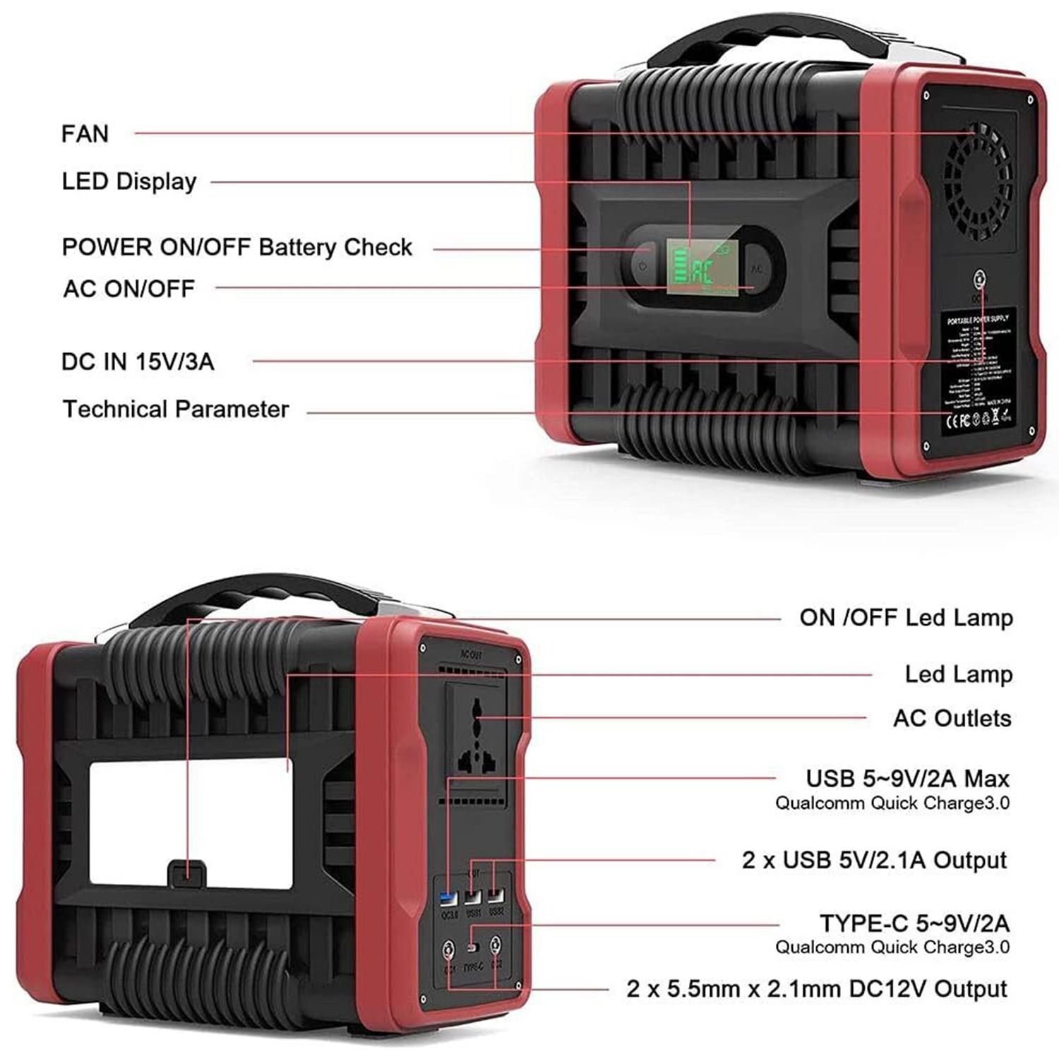 • 详细介绍 • 技术规格 • 电池类型:高质量锂离子电池 • 容量:222Wh(相当于60,000mAh/3.7V) • 尺寸(长*中*高):213 X 106 X 180 毫米 • 重量:约2.4kg • 输入充电:适配器:DC 15V / 3A • 电池板充电:DC 13V - 25V / 3.0A(最大)• USB 输出:2 x USB 5V - 2.1A(最大)• : 1 x USB 5 ∽ 9V / 2A (QC3.0) • : 1 x Type-C 5 ∽ 9V / 2A (QC3.0) • 直流输出:DC 9 ∽ 12.5V / 10A (15A Max) • 交流输出:200W/ 320W (最大)• 生命周期:> 500 次 • 版本:220V/50Hz • 安全保护:过充/过放/过压/过流/过功率/短路/过热