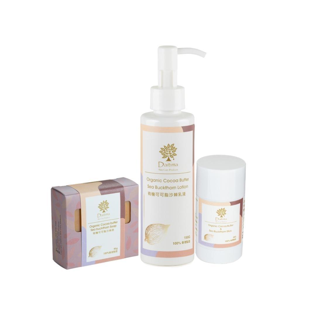 *功效主要软化干燥皮肤, 深层滋润, 保湿修复, 减淡皮肤敏感色斑。由清洁、护肤、以及舒缓患处使用的,一应俱全。全方位保护肌肤,天然有机。套装包括以下三款产品:(1) 有机可可脂沙棘膏 ( 30g ) : 修复龟裂位置,促进皮肤再生(2) 有机可可脂沙棘乳液 ( 150ml ) : 修复干燥表面及软化干硬的皮肤(3)有机可可脂沙棘皂 ( 85g ) : 清洁同时深层滋润及保湿修复干硬的皮肤,沐浴后,完全没皮肤猛紧及干燥的感觉。 有机可可脂沙棘套装,对干燥皮肤、爆坼有极强的修复皮肤效果。婴儿、孕妇及长者都非常适合使用。绝不含化学成份、香料及化学防腐剂等, 所有令皮肤容易产生敏感症状的致敏源成份。