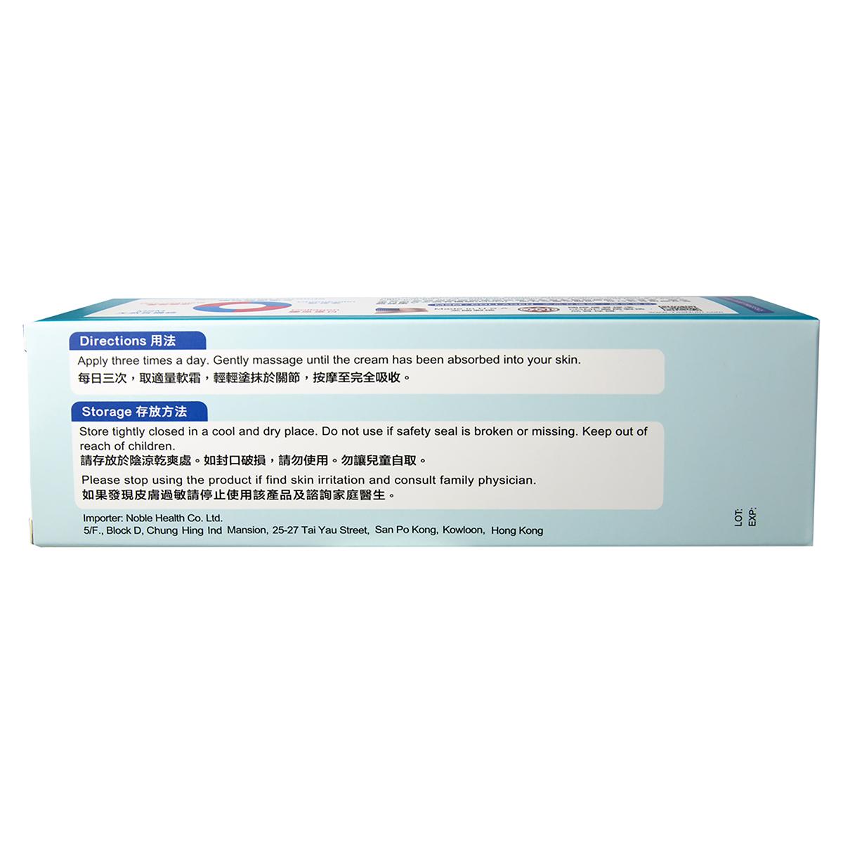 卓营方葡萄糖胺关节修护软霜为受关节健康问题困扰人士提供保护,包括过度劳动、肥胖、缺乏运动人士、低头族、年长者等。本产品配合4种高质量元素,包括葡萄糖胺、软骨素、胶原蛋白及天然有机硫(MSM),可促进软骨组织的修补,一抹即可渗透皮肤并直达痛处,适用于手腕、手指、膝头、腰背、颈椎等部位,是服药以外另一良择。