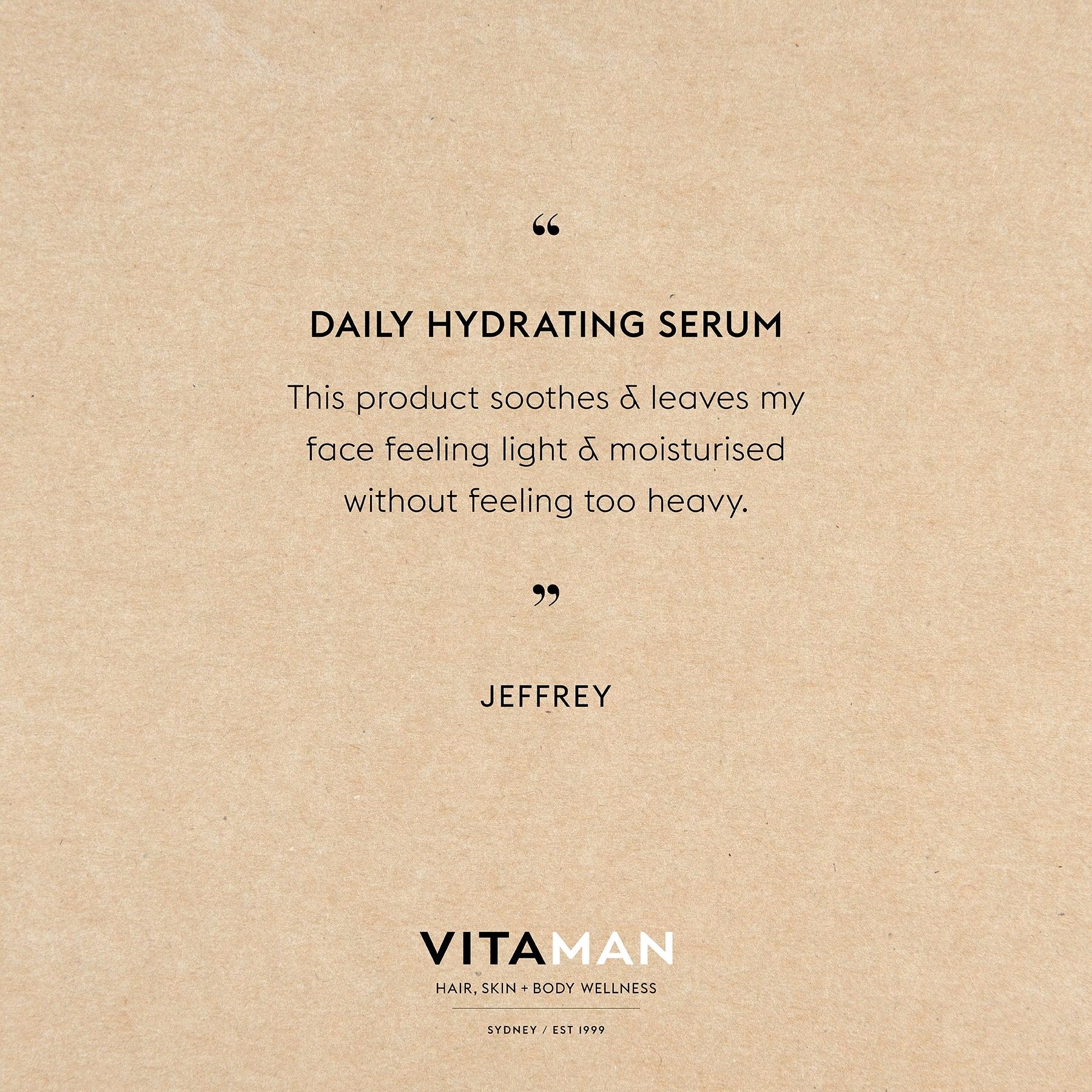 VITAMAN DAILY HYDRATING SERUM 男士深层保湿精华 - 适合所有肤质 - 含丰富抗氧化剂 A、B3 和 C,保湿前的强效打底霜 - 新配方添加美白抗衰老最强成份 - Vitamin B和Vitamin A - 对油性皮肤的来说是完美的防晒霜 - 超轻配方吸收迅速,保湿滋润,哑光效果