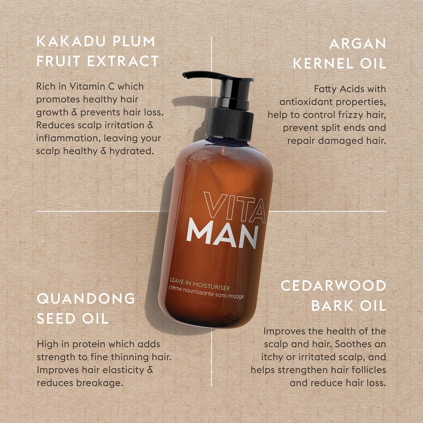 VITAMAN LEAVE IN HAIR MOISTURISER 轻盈免冲洗护发素可以深层滋养头发,使其恢复活力,同时有效滋润头皮,防止紧绷和干燥的感觉。采用标志性的澳洲天然植物和精油混合而成,适用于所有发质,对于中性至干性发质,卷发或波浪发型尤其有效。